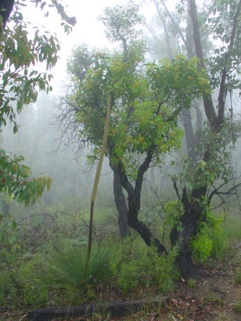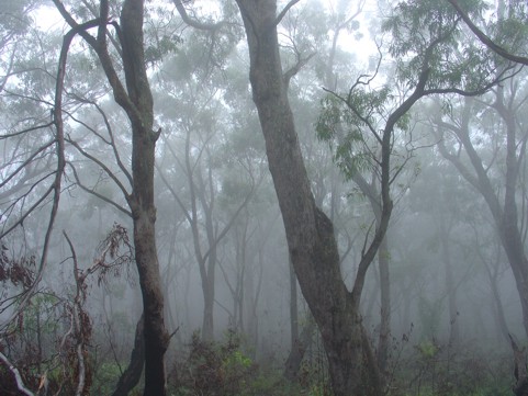 Der erste Blick nach draußen zeigte Nebel, tiefe Wolken, Nieselregen. Man konnte kaum ein paar Meter geradeaus sehen. Sollte das Wetter hier immer so sein ? Zum Glück wollten wir heute ein wenig "Bushwalking" machen. Da stellt man keine großen Ansprüche ans Wetter. Im Ort haben wir im erstbesten Laden ein gutes Frühstück eingenommen. Die Auswahl in Blackheath fällt recht leicht, so viele verschiedene Läden gibt es hier nicht. Nach nur ein klein wenig in der Gegend rumsuchen sind wir am Parkplatz des Canyon Walk angekommen und losgestiefelt. Der Walk ist ein Rundkurs. Vom Parkplatz Govetts Leap/Evans Lookout geht es hinunter in die Schlucht und am anderen Ende wieder hinauf. Man kommt oben an der Straße am Neates Glenn/Grand Canyon - Parkplatz wieder heraus. Für welche Richtung man sich entscheidet, ist einem selbst überlassen.