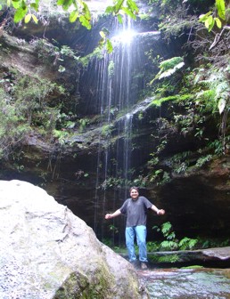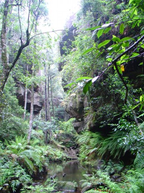 Während des Abstieges sah man sehr viel verbranntes Land ringsherum. Hier musste es vor gar nicht allzu langer Zeit gebrannt haben. Überall am Weg standen verkohlte Baumstümpfe und teilweise waren die Planken, die den Weg zumindest grob im Zaum hielten auch ein wenig angekokelt. Recht interessant war es anzusehen, das sich trotz des großen Schadens, den das Feuer offensichtlich angerichtet hatte, überall wieder neues Grün entwickelte. Sogar auf teilweise komplett verkohlten Baumresten spross es teilweise schon wieder. Der Abstieg war stellenweise recht steil und ging über Stock und Stein und ein paar Bäche zum Fuß des Canyons. Unten ging es immer dicht am Fels weiter. Manchmal stand einem ein kleiner Wasserfall im Weg der durch- oder auch umquert werden musste. Teilweise war man fast direkt am Boden des Canyons unterwegs, zum Teil aber auch irgendwo am Fels und es ging links noch etliche Meter steil runter ins Dunkle. Der Weg ist nicht ein wirklicher Wanderweg, es ist vielmehr ein wenig ein Mix aus Gehen, Klettern und Kraxeln. Aber nicht wirklich anstrengend. Einen Vorteil hatte der Abstieg noch. Wir waren unter dem Nebel abgetaucht und hatten hier unten freie Sicht. Die Strecke ist sehr schön und mal eine Abwechselung. Allerdings ist sie keineswegs eine Tagestour. Wir sind so gegen Mittag gestartet und waren um 15 Uhr wieder zurück. Da wir nicht so recht wussten, was noch zu tun war (wir hatten uns auf einen ganzen Tag dort eingerichtet und nicht damit gerechnet um 15 Uhr schon wieder fertig zu sein) haben wir erst mal ein wenig die Karten studiert und uns entschieden erst mal ins Megalong Valley hineinzufahren. Praktischerweise geht nämlich direkt von Blackheath aus eine Straße dorthin ab. Je weiter wir in dieses Tal hineinfuhren, desto besser wurde das Wetter. Hin und wieder bekam man sogar mal einen Sonnenstrahl mit. So wirklich interessant war die Tour aber abgesehen von der tollen Landschaft nicht. Nach einem Bierstopp an einer Ranch sind wir auch wieder zurück in das schlechte Wetter gefahren. Nächstes Ziel : unbekannt. Wir sind einfach, sozusagen ins Blaue, aus Blackheath raus in Richtung Lithgow gefahren. Das war auch der äußerste Punkt, der auf unserer Blue Mountains-Karte eingetragen war. Der Weg dorthin war eine gemütliche Fahrerei durch kleine Örtchen an denen alles recht verschlafen aussah. Auf unserer Karte waren für Lithgow zwei interessant klingende Attractions eingetragen. Die Zick Zack Eisenbahn (Zig Zag Railway) und der Glowworm - Tunnel. Da haben wir uns gedacht, wenn die schon im Zick Zack fahrende Eisenbahnen und leuchtende Würmer haben, sind wir da bestimmt richtig.