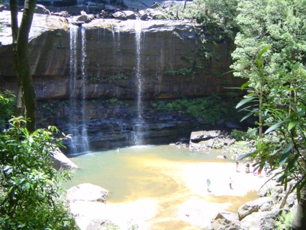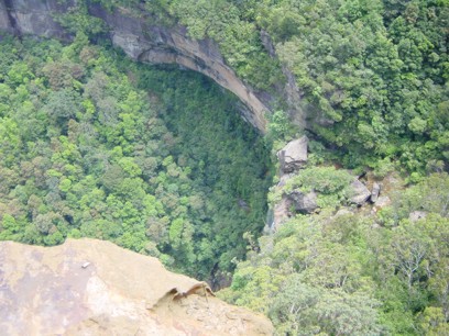 Zuerst geht es an den Falls immer am Fels entlang steil hinunter ins Tag und zum Fuß der Falls. Die Fälle fallen in mehreren Terrassen hinunter ins Tal. Der Weg hinunter ist teilweise recht urig. Von in den Fels gehauenen Stufen, über steile Stellen, die mit einem Seil zum festhalten ausgestattet sind bis zu stählernen "Feuerleitern" gibt's alles. Auf ca. ¾ des Weges hätte es noch eine Abkürzung gegeben um nicht ganz hinunter gehen zu müssen (der National Pass). Dieser Weg war aber wegen Instandhaltungsarbeiten leider gesperrt. Hm, Chance verpasst. Also doch der schwere Weg. Schwer war der Weg aber eigentlich doch nicht. Das Heruntersteigen ist ja nicht wirklich anstrengend und ganz unten ging's auch recht eben immer am Fuß der Berge entlang. Interessant war, das hier die Landschaft komplett anders war wie im nicht weit entfernten Blackheath und dem Canyon Walk von gestern. Hervorstechender Unterschied : hier hatte es nicht gebrannt. Das war wohl nicht zuletzt der Grund dafür, das man teilweise im Busch dort einen Eindruck von "grüne Hölle" hatte. Hier gab's auch längere normale Gehstrecken. Kraxeln und Klettern hielt sich dezent im Hintergrund. Allerdings war der Aufstieg am Ende wirklich heavy. Es war mir die ganze Zeit schon im Hinterkopf herumgespukt. Je weiter wir runtergestiegen sind desto lauter hörte ich eine innere Stimme : Das musst du alles wieder hoch ! Mörderisch. Ein Wort das die Situation wirklich gut beschreibt. Vor allem, wenn man nicht weiß wie lange es noch weitergeht. Um jede Kurve erwartet man den Gipfel doch dann kommt immer nur noch ne Leiter, die steil nach oben führt. Kurz vor dem endgültigen Kollaps (ich war kurz davor einfach sitzen zu bleiben und mich später vom Nationalparkhubschrauber retten zu lassen) sind wir aber dann doch oben angekommen und haben den Kiosk dort oben erst mal um etliche Getränke erleichtert. Unten hatten wir noch gedacht, das auch diese Strecke ähnlich schnell beendet sein würde wie gestern der Canyon. Der Aufstieg hat sich jedoch ziemlich gezogen (in Bezug auf Strecke und Zeit), so das es jetzt doch schon späterer Nachmittag war.
