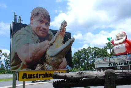 Für heute hatten wir uns den Crocodile Hunter und seinen Australia Zoo auf den Stundenplan geschrieben. So sind wir dann so gegen 10 aus Brisbane über einen netten und verdammt verstopften Highway (da haben die mal ne nette Autobahn und schon is da Stau, tststs) wieder zurück in die Glasshouse Mountains und zum Zoo gefahren. So gegen 11 Uhr sind wir dort aufgeschlagen und wurden von vielen netten Helferlein auf die fussballfeld-großen Parkplätze geleitet. Verdammt viel los hier. Ich dachte schon, gleich biegen wir um die Ecke und es steht wie im Phantasialand ein Schild "Ab hier Wartezeit 60 Minuten" oder sowas. Aber trotz der Massen ging es alles doch recht zügig. Schon an der Kasse wurde man auf die um 11 Uhr 30 beginnende Show im neuen "Crocoseum" mit Steve himself aufmerksam gemacht. Man musste auch garnicht auf den Plan schauen, man musste nur den Menschen folgen und schon stand man vor dem neuen Stadion. Heute war übrigens Einweihung. Steve wollte heute dort seine erste Croco - Show aufführen. Na, da hatten wir uns ja den richtigen Tag ausgesucht.