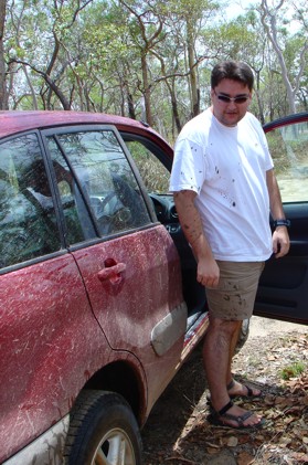 In der Lodge hatte man uns gesagt, kurz nach der Brücke über den Big Annan sollten wir scharf links in den Wald fahren zu einer natürlichen Flussbiegung. Dort sollte man hervorragend Krokodile sehen können. Die recht versteckte Abzweigung war auch schnell gefunden. Der überdimensionale riesige Schlammtümpel der uns danach begrüßte machte da schon mehr Sorgen. Recht vorsichtig haben wir uns hinein begeben. Ich habe dabei immer ein wenig besorgt zur Seite rausgeschaut, wie tief die Brühe denn nun war. Mit gutem Schwung und eine mächtige Bugwelle vor uns hertreibend sind wir durch den Rest des Loches. Kurz vor Ende meinte die Bugwelle dann über Motorhaube und rechte Fahrzeugseite schwappen zu müssen. Blöd dabei war nur, das ich das Fenster offen hatte und ich so einen schönen Teil des Schlammes über mich und das Fahrzeuginnere abkriegte. Sauerei. Eintrag ins persönliche Notizbuch: Zukünftig bei Durchfahren großer Wasserflächen Fenster schließen. Das Ergebnis waren dreckige Klamotten, Dreck im Auto und keine Krokodile (denn natürlich hatten die Viecher an diesem Tag alle Urlaub oder waren sonst wie verhindert).