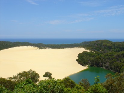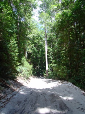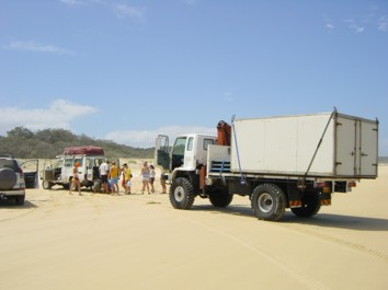 Vom See aus sind wir dann einem Schild in Richtung Strand gefolgt. Nach einer ganzen Zeit stellten wir zuerst fest, das der Temperaturanzeiger im roten Bereich stand und dann das der Motor den Geist aufgab. Da standen wir nun. Mitten auf der Piste und wie sich nach todesmutigem öffnen der Motorhaube herausstellte, ohne Kühlerwasser. Der Schlauch zum Kühler war kaputt. Nach einer ganzen Zeit füllte sich zu beiden Seiten der Weg. Und hier möchte ich ein großes Kompliment an alle Australier allgemein und die netten Leutchen von Fraser Island im speziellen aussprechen. Alle haben sofort geholfen, ob es Flickband um den Schlauch wickeln oder ein paar Schluck Wasser in den Kühler schütten war. Oder einfach nur ein paar aufmunternde Worte sprechen. Keiner war mehr in seinem Auto, jeder stand bei uns und hat sich beteiligt. Irgendwann war genug Klebeband um den Schlauch gewickelt und der Kühler aufgefüllt. Als der Motor wieder abgekühlt war ging er dann auch wieder an. Nach freundlicher Verabschiedung von allen konnte es also (solange das Klebeband trägt) weitergehen. Uns war natürlich klar, das wir so nicht bis unendlich weiterfahren konnten. Wir waren auf jedem Meter darauf gefasst, das der Schlauch wieder aufging. Es reichte aber noch, einen weiteren idyllischen See, der von drei Seiten von Wald und von einer Seite von einer riesigen Sanddüne eingefasst war, zu sehen. Auf dem weiteren Weg zum Strand war dann endgültig Ende. Mit lautem Getöse flog das Klebeband ab und wir standen wieder ohne Wasser da. Das erste Auto, das in unsere Richtung vorbeikam, war leider total besetzt. Die Leute versprachen aber, im Ressort bei der Vermietfirma Bescheid zu sagen, wo wir seien. Da wir nicht auf unsere Rettung warten wollten, haben wir die Kiste dort stehen lassen und sind zu Fuß weiter. Nach kurzer Zeit kam noch jemand vorbei, der uns den weiteren Weg mitgenommen hat. Ein netter Australier, der auf dem Weg zum Angeln war. Seine Frau hatte er zum "sunbaking" im Ressort gelassen. Er hatte nen heißen Reifen drauf und so waren wir recht zügig am Strand.