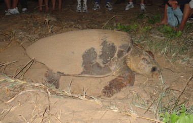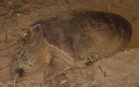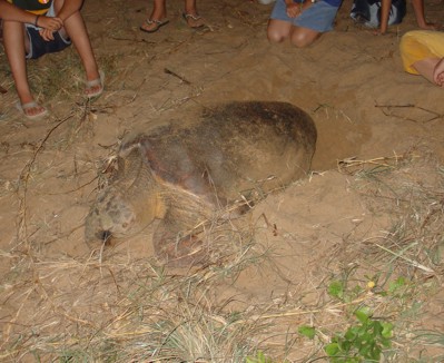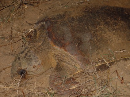 Auf der Fahrt dorthin hat Stephan noch ein paar Fraser Anbieter direkt angerufen und auch wirklich noch einen Laden gefunden, der für den 24. Dezember noch ein Auto für uns hatte. Es war eine Tagestour, Fly and Drive. Man fliegt morgens von Hervey Bay rüber, nimmt ein Auto den Tag über und abends/nachmittags geht's per Flieger wieder zurück. Froh, überhaupt noch was bekommen zu haben, haben wir das zugesagt. Eventuell wollten wir am 25. noch eine zweite Tagestour hinterher schieben, je nachdem ob noch was zu bekommen war. Ein Motel in Bargara war schnell gefunden und die wirklich nette Frau an der Rezeption hat uns auch gleich den Rat gegeben, möglichst schnell weiter nach Mon Repos zu fahren um dort möglichst früh für die Schildkröten anzustehen. Dazu muss man wissen, wie das Prozedere dort abläuft. Mon Repos ist ein Strand, an den jeden Abend große Meeresschildkröten (Loggerhead Turtles) zur Eiablage kommen. Es hat sich dort ein Besucherzentrum etabliert, welches das Beobachten der Schildkröten in geordneten Bahnen ablaufen lässt. Der Besucherstrom ist reglementiert und alles wird von Personal überwacht. Nun geschieht Folgendes. Alle anwesenden Leute werden ab 18 Uhr in Gruppen zu je 70 Leuten eingeteilt. Wenn eine Schildkröte an den Strand kommt (das kann früher, später oder nie geschehen) darf die erste Gruppe dort hin und zusehen. Die zweite Gruppe wird erst an den Strand gelassen, wenn eine weitere Schildkröte den Strand besucht (was wiederum früher, später oder nie der Fall sein kann). Und so weiter und so weiter. Man kann sich vorstellen, das man auf diese Weise auch mal bis zum anderen Morgen dort verbringen kann (Webinfo hier oder hier). Durch den weisen Rat der Motel-Frau waren wir noch früh genug, um in die erste Gruppe eingeteilt zu werden (Nummer 68 und 69, puhhh). So gegen 19 Uhr kam dann die Durchsage, das die erste Schildkröte am Strand sei und es losgehen könne. Man kann in der folgenden Zeit recht nah bei dem Tier sein und beobachten, wie es ein Loch gräbt, die Eier ablegt und dann einen immensen Aufwand treibt, das Loch wieder zuzuschütten und sich dann schließlich wieder zurück ins Wasser macht. Das ganze Prozedere hat ca. eineinhalb Stunden gedauert und war wirklich interessant. Ich hatte noch nie solch ein Tier "in freier Wildbahn" gesehen (geschweige denn überhaupt gesehen, außer im Fernsehen). Und zu beobachten, wie sich das Tier auch durch den großen Trubel drumherum nicht stören lässt, die Eier ablegt und wieder verschwindet vermittelt schon ein privilegiertes Gefühl.