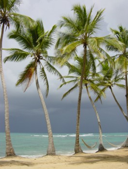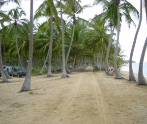 Dort gab's Hängematten zwischen Palmen zum Relaxen und ein gutes (Nach-)Mittagessen mit Schweinekoteletts, Reis und Salaten. Es schmeckte echt gut, ich hoffe aber das es nicht aus einem Dorf auf dem Weg von der Straße war. Der Strand war ebenfalls schön, jedoch etwas „rauer“ als beim Hotel. Man konnte deutlich sehen, das das Meer hier mit mehr Wucht an den Strand rollte. Hier wird der Atlantik nicht vorher von einem Riff "gezähmt". Von hier aus ging's wieder Richtung Osten nach Punta Cana / Bavaro. Diese letzte Strecke war noch eine längere Etappe, auf der man im Hinterland von Punta Cana noch etliche andere Hotelanlagen gestreift hat. Gegen Ende der Tour hat noch mein Beifahrersitz den Geist aufgegeben. Nachdem Stephan eine Kurve etwas unsanft genommen hatte, meinte die Rückenlehne meines Sitzes mit mir umfallen zu müssen. Naja. So passte das auch besser zur kaputten Rückbank, die bei jedem Schlagloch abgehoben hat. Gegen Abend, besser gesagt so gegen halb 8, waren wir dann wieder am Hotel. Für diesen Tag reichten die Unternehmungen auch aus. Die ganze Fahrerei und das Geholpere waren doch eigentlich recht anstrengend. Fazit
