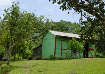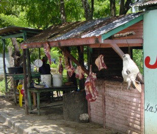Danach ging die Fahrt im Hinterland weiter in Richtung Berge. Schon im Anlauf in etwas hügeliges Gebiet konnte man sehen, das sich die Vegetation deutlich in Richtung sattgrün und üppig änderte. Über teils normale Piste und teils nicht mehr als Straße erkennbare Pfade fuhren wir durch die Landschaft. Immer wieder kam man an kleinen Ansiedlungen vorbei. Hier konnte man zum einen die typische Bebauung des Landes erkennen. Kleine aber farbenfroh hergerichtete Bauten. Zum anderen gab's ersten Kontakt mit der Sitte Fleisch nach dem Schlachten draußen an der Luft überm Bürgersteig hängen zu lassen. Von ganzen Schweinehälften bis zu Kuhköpfen hängt hier alles rum. Lt. Aussage des Tourguide ist dies normal und die beste Art Fleisch zu kaufen. Angeblich wird alles innerhalb von einem Tag verkauft (na hoffen wir das mal). Bei einem Stopp bei einem Bauern erklärte der Tourguide dann (übrigens außer in spanisch noch in portugiesisch, französisch und deutsch !!) wie Kakao gemacht wird, wie einzelne Früchte angebaut werden etc. Es gab die Gelegenheit diese Früchte und den Kakao zu kosten. Da der Bauer natürlich an unserer Anwesenheit auch was verdienen wollte, gab es Kaffee und Kakao auch zu kaufen. Nach einer kurzen Demonstration eines (zugegeben gestellten) Hahnenkampfes ging die Fahrt weiter. Aus der bergigen Region kamen wir wieder in flachere Landschaft mit normalen Straßen und Siedlungen. Nach längerer Fahrt in den nördlichen Teil der Insel endete diese Etappe an einem schönen Strand. Lt. Aussage des Guide der "Coconut Beach", steht zwar so in keiner Karte, aber egal :-)