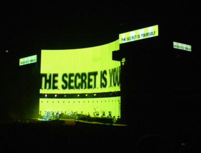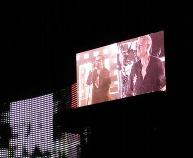 Kurz vor 22 Uhr dann der Beginn. Von Anfang an eine höllische Stimmung. Unos, dos, tres, catorze .... Hello Hello Vertigo ..... hola. Das Prublikum nicht zu bremsen. So eine tolle Stimmung habe ich auch bisher nicht erlebt. Gänsehaut. Und laut wars. Sowohl Publikum als auch die Musik. Irgendwie fast weggeblasen von der Lautstärke. Vollends geschehen wars dann, als Edge ein Fußballtrikot des FC Barcelona angezogen hat. Spanien flippt aus ! Die Zeitungen werden am nächsten Tag schreiben, das 85.000 Zuschauer dort waren. Also das U2 Konzert mit der größten Zuschauerzahl der ganzen Tournee.