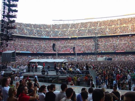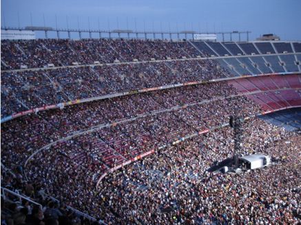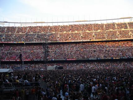 Nach den ganzen Gerenne haben wir uns auf dem Plaza de Rius beim großen Uhrenturm in einer Bar niedergelassen. Bier bestellen ging ja mittlerweile, das "cerveca grande" kam ja schon flott von den Lippen. Allerdings beim Rest gabs schon noch das ein oder andere Problem. Eine Speisekate komplett auf spanisch, war schon ein wenig knifflig. Irgendwie haben wir es aber dann doch geschafft die wirklich schlimmen Sachen zu umschiffen und etwas essbares zu bestellen. Ein paar Tapas, patatas ( Kartoffeln ) mit scharfer Soße, große belegte Brote mit Hühnerbrust. Alles sehr lecker. Hier haben wir noch sehr lange gesessen. Sehr gemütlich. Das Bier schmeckt und das Essen auch. Was will man mehr. Sehr positiv : Als wie bezahlen wollten, stand nur, na sagen wir mal, ein Drittel der Sachen auf der Rechnung. Einen halben Nachmittag durchgetrunken und gegessen für 10 Euro. Klasse. Schnell bezahlt und schnell abgesetzt. So gegen 18 Uhr sind wir dann also Richtung Stadion aufgebrochen. Die UBahn war nicht die schnellste, so das wir erst irgendwann zwischen halb 7 und 7 am Stadion waren. An der Kartenabholkasse war schon die Hölle los, also erst mal da angestellt. Irgendwann eine Stunde später und nach ein wenig vordrängeln hatte ich endlich meine Karten für das größte Stadion Europas in den Händen ! YES ! Alle Beteiligten waren ähnlich glücklich darüber wie ich und so sind wir langsam zum Einlass gepilgert. Einlaßprozedur kein Problem. Wir haben noch länger draußen am Bierwagen gestanden und sind dann auch erst irgendwann gegen, na, halb 9 ins Stadion gegangen. Und was jetzt kam, war der Höhepunkt des Tages. Der erste Rundblick durchs größte Stadion Europas. Da kommt man um die Ecke und sieht dann 5 Etagen Zuschauerränge vor sich aufragen. Boah ! Dazu kam das unsere Plätze wirklich super waren. Ganz nahe der Bühne und fast direkt am Innenraum dran. Mega-genial. Ich bin dann noch ganz nach oben in der Gegenkurve hochgeklettert und ein paar Fotos geschossen. Dort oben war der Blick schier unglaublich.