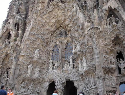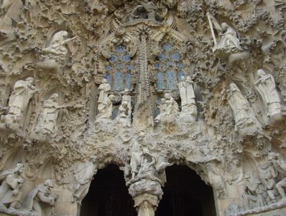 Das Haus kann man von innen besichtigen. Hauptziel dabei das Dach mit den kurios gestalteten Schornsteinen. Leider standen die Leute auf dem Bürgersteig schon in einer langen Schlange. Irgendwo weiter vorne stand ein Schild mit "ab hier noch 30 Minuten" Aufschrift. Irgendwie hatten wir aber keine Lust so lange zu warten. Wir dachten uns : Heute ist Sonntag, morgen ist auch noch Zeit. Morgen am Montag ist bestimmt noch so viel los. Also kommen wir morgen wieder. Gesagt, getan. Kurz auf die Karte geschaut und durch das Straßengewusel weiter Richtung Gaudi-Kathedrale "Sagrada Familia" gegangen. Auf dem Weg dorthin sind wir noch an ein paar anderen interessanten Gebäuden vorbeigekommen und plötzlich sieht man die Turmspitzen über den anderen Häusern aufragen. Dann eine Ecke weiter und man steht unvermittelt vor der Rückfassade der Kathedrale. Ich muss sagen : Sehr beeindruckend. Alles sieht irgendwie "anders" aus, als man es bei einer großen Kirche gewohnt ist. Sogar die Kirche an sich ist ein Gegensatz. Hinten die Passionsfassade, mit vielen eckigen Formen und Figuren. Vorne die Weihnachtsfassade, die Gaudi selbst noch gebaut hat. Diese mit sehr vielen Details in fließenden Formen. Von etwas Abstand betrachtet, sieht die Fassade irgendwie aus wie geschmolzen und verlaufen.