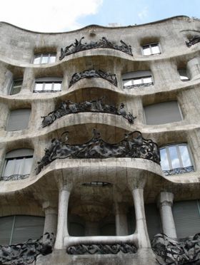 Ein paar Meter weiter die Straße hinauf kann man schon das Gaudi Haus "Casa Mila" sehen. An der Straßenkreuzung mit bestem Blick auf die Hausfassade kann man wunderbar die geschwungene Außenfassade bewundern. Das Haus sieht von außen recht Steingrau aus und auch sehr massiv. Laut Reiseführer wird es bei den Spaniern auch scherzhaft "Der Steinbruch" genannt. Von dem Haus sagt man, das Gaudi es ohne einen einzigen Rechten Winkel oder eine Ecke gebaut hat. Wenn man davor steht kann man sich das auch ganz gut vorstellen. Auch interessant von Nahmen die tollen eisernen Balkongeländer.