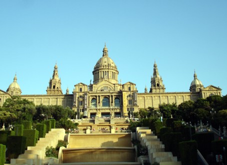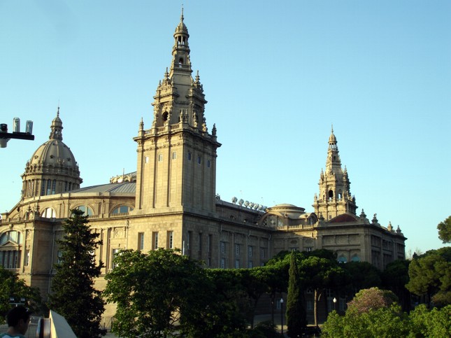 Da ich hier nix machen konnte, bin ich die Straße weiter hoch und wollte eigentlich zur Talstation der Mont Juic Bergbahn. Laut der Karte sollte die Bahn von der UBahn-Station Paral-Lel losgehen. Mir war auch noch ganz dunkel im Hinterkopf das genau dem so ist, ich habe es aber doch wider besseren Wissens nicht einsehen wollen. Also bin ich weiter in das Viertel rein und dachte die ganze Zeit "hier muss doch die Bahn irgendwo losgehen". Schließlich stand ich vorm Berg und wusste, das ne ganz blöde Idee war. Also zwei Möglichkeiten : Zurück zu Paral-Lel oder den Berg hoch. Ich bin also den Berg hoch. Da geht ne Straße hoch. Nach zwei Kurven gabs nen Abzweig den ich versucht habe. Von hier konnte man eine recht versteckte, steile Treppe hochklettern und ist oben unmittelbar neben dem (endgenial gelegenen) Schwimmstadion rausgekommen. Von den Zuschauertribünen und aus dem Schwimmbecken hat man einen Überblick über die ganze Stadt ! Ein Stück weiter die Straße hoch beim Olympiastadion war wieder ziemlicher Betrieb. Dort fand gerade irgendein Leichtathletik-Wettbewerb statt. Auch wieder ziemlich was los. Ich hab von draußen noch ein wenig zugeschaut aber doch schnell die Lust verloren. Quer durch den Park auf der anderen Straßenseite gehts zu den Rolltreppen, die einen direkt zum Palau Nacional, den riesigen Freitreppen und dem noch riesigererem Springbrunnen. Direkt davor erstreckt sich der Placa d'Espanya mit nie versiegenden Dauerverkehr.