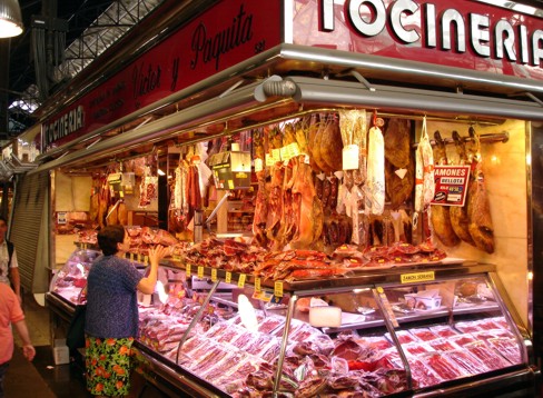 Die Fußgängerzone war so voll, das man kaum treten konnte. Immer wieder interessant die ganzen Stände mit Vögeln und anderen Tieren ( die hatten sogar riesige Hühner dort zu verkaufen ). Beim Weg runter bin ich rechts zum Mercado "Mercat de la Boqueria" abgebogen. Einen Rundweg um die Schinkenstände und Obstauslagen und einen frischen Fruchtsaft später gings weiter. Die angrenzenden Viertel wie Gotic und Katedral hab ich diesmal links liegen lassen. Zu meiner Schande muss ich noch gestehen, das ich mir die Essensauswahl heute sehr leicht gemacht habe und den nächsten Burger King angesteuert habe (Schande Schande Schande). Ein Super Doppel Whopper Dingens Menü später war ich unten an der Kolumbus-Säule und hab noch ein wenig das schöne Gebäude und die beeindruckenden Wasserspeier fotografiert. Auf dem Weg zurück bin ich zum Palau Güell abgebogen (geht direkt von den Ramblas ab, ist ausgeschildert und nicht zu verfehlen). Letztes mal war das ganze Haus wegen Renovierung geschlossen. Und jetzt, drei Jahre später ..... IMMER NOCH !!! Arrgh. Das Erdgeschoss war wohl geöffnet wenn ich die Schilder richtig gedeutet habe. Das Dach und die obere Etagen (die beiden Attraktionen) waren aber immer noch zu. Doof.