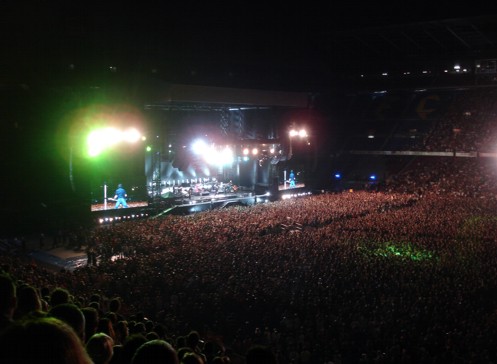 Ladies and Gentlemen E - STREET BAND Als ich mit dem Klängen der letzten Stücke im Kopf dann aus dem Stadion raus bin und zur UBahnstation gepilgert bin, genauso wie gestern, dachte ich noch an nix böses. Als ich gerade bei der UBahn um die Ecke bog, hörte ich dann schon ein Zuschlagen eines großen Gitters. UBahnmitarbeiter waren gerade dabei ohne etwas böses dabei zu denken, die UBahn abzuschließen. Irgendwie hatte denen wohl keiner gesagt, das da jetzt tausende Leute vor der Tür stehen, die gerade vom Springsteen Konzert kommen. Die kuckten schon ziemlich verdutzt von unten auf die oben wartenden Massen. Und wie der UBahnbedienstete so ist. Er hält seine gewerkschaftlichen Zeiten ein und schließt die UBahn ab, basta. Und wie der Spanier als solches so ist, ging oben direkt Zeter und Mordio los und diverse Leute haben wirklich wüst zu den UBahnleuten runter geschimpft.