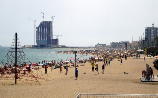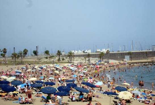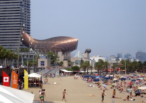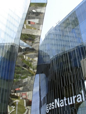 Nach dem späten Start von gestern wollte ich heute mal recht zügig raus um mein Programm zu machen. Ok. So früh wars denn auch nicht. Irgendwann um Mittag herum war ich dann auf der Straße. Erstes Ziel war wieder die Ramblas, nur diesmal nicht zu Fuß sondern mit der Bahn. Fotoapparat heute auch nicht vergessen, also konnte nix schiefgehen. Einmal zügig die Ramblas runter habe ich mir unten irgendwo ein ner Seitenstraße, da wo die Lädchen schon wieder ein wenig schmuddeliger werden, ein großes Salami Baguette gegönnt und unten einmal über den Platz und über die Fußgängerbrücke in der Sonne vor dem Maremagnum ne Mittagspause eingelegt. Auch hier wieder unglaublich viel Betrieb. So viele Leute hab ich hier unten noch nicht gesehen. Nach ausgiebigen Pause-machen und Leute beobachten hab ich mich aufgemacht und bin an diesem Maramagnum-Einkaufszentrum-Ding vorbei, weiter am IMAX und am Aquarium entlang Richtung Stadtteil Barceloneta marschiert. Irgendwo auf dem Weg kommt man an der fetten Zentrale des örtlichen Gasversorgers vorbei. Ein sehr futuristische Glaspalast.