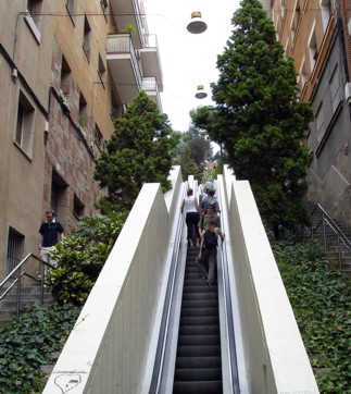 Bekommen habe ich das so ziemlich genialste Salami-Brot, was ich bisher gegessen habe. Dickes Brot mit Kräutern, Tomatenmark, Öl und dicker Salami belegt. Jamjamjam. Und vor allen, übelst billig wars auch noch. Das Brot und das Bier haben 3 Euro irgendwas gekostet. Später hab ich mich dann wieder auf die Rückreise gemacht. Zuerst mit der "Funi" (so nennen die hier diese alte Bergbahn) runter und dann wieder mit blauen Tram runter in die Stadt. Da ich jetzt noch recht viel Zeit hatte bis zum Abflug, habe ich mir gedacht, das ich diese Zeit ganz gut im Park Güell verbringen könnte. Von der Av. Tibidabo bin ich zu Fuß weiter und mit meiner Straßenkarte bewaffnet kreuz und quer durch die Viertel grob in Richtung UBahnstation Vallarca marschiert. Irgendwo da hab ich zwar ganz kurz gedacht ich hätte mich verlaufen, aber dann habe ich eine Straße weiter durch die Gasse die Rolltreppen gesehen, die auf den Berg zum Park Güell raufgehen. Das hatte ich noch vom letzten Mal im Kopf. Man muss den steilen Berg nicht hochmarschieren. Man kann in einer ganzen Kaskade von Rolltreppen bis fast ganz rauf fahren. Von dieser Richtung kommt man sozusagen durch den Hintereingang in den Park rein. Man kann dann von oben herunter auf die Terrasse mit den wellenförmigen Bänken hinuntergehen. Überall war recht viel Betrieb und ich hab mir hier in der Gegend irgendwo ein Bänkchen gesucht und mich in die Sonne gesetzt und was gelesen.