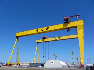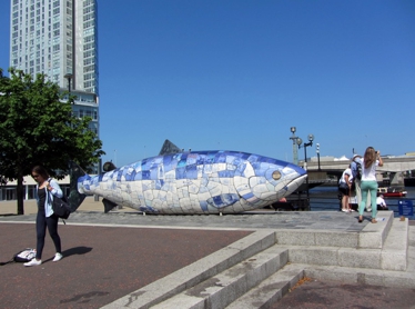 Ich bin die angrenzenden Straßen noch ein wenig rumgegangen, bis ich einen offenen Supermarkt gefunden hatte. Dort habe ich ein paar Pullen Wasser gekauft und diese direkt ins Hotel verfrachtet. Von hier aus bin ich dann los in Richtung Titanic Quarter. In Belfast wird an jeder Ecke mit Titanic geworben und im Hafengebiet wurde ein riesiges Stück Land neu entwickelt mit neuen Wohnungen, Hotels und der niegelnagelneuen Titanic Ausstellung. Das ganze Areal hat man Titanic Quarter getauft. Weil das jetzt nicht allzu weit aussah, dachte ich ich, geh mal eben zu Fuß dahin. Hmmm. Bis ans Ufer des Flusses mit der großen Keramikforelle wars nicht weit. Das stimmte schon mal. Der restliche Weg über den Fluss, dann an dem riesigen Komplex des Odyssee mit der großen Halle Odyssee Arena vorbei und weiter um die Ecken an ein paar Hotels und Apartmenthäusern vorbei war aber schon weiter.