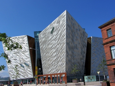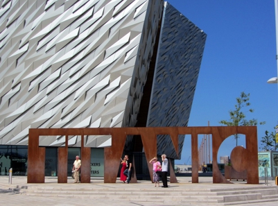 Dann um die Ecke ragt plötzlich diese Titanic Ausstellung auf. Das ist schon sehr imposant. Wie ich später erfahren habe, sollen die vier ääh Zacken den Bug der Titanic symbolisieren und sind von der Höhe her exakt so hoch, wie die Titanic damals war. An der Kasse konnte man Kombitickets kaufen für die Ausstellung und das sog. Pumphouse. Das Pumphouse ist das Trockendock wo damals die Titanic mal gelegen hat mit der zugehörigen Pumpstation. Wegen der doofen Öffnungszeiten bin ich aber zuerst zum Pumphouse gegangen. Die Ausstellung wollte ich dann auf dem Rückweg sehen. Wegbeschreibung : Immer der Straße folgen. Und hier gehen dann die Schätzungen auf einmal auseinander. Die Frau an der Kasse sagt : 12 Minuten Fußweg. Das Prospekt sagt : 15 Minuten Fußweg. Ein Schild sagt : Kurzer Fußweg. Meine Aua Füße haben hinterher gesagt : eine halbe Stunde strammer Gang. Wenn ich gewusst hätte, das ich in der Hitze so weit latschen musste hätte ich es sein lassen.