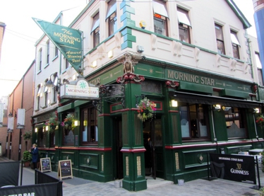 Ich habe jetzt die genaue Reihenfolge nicht mehr im Kopf, aber die einzelnen Abteilungen der Ausstellung widmen sich verschiedenen Stationen der Geschichte der Titanic. Ganz am Anfang startet es mit der Zeit in Belfast vor dem Schiffsbau und wie sich alles verändert hat mit Bau der Schiffe in der Harlan & Wolf – Werft. Dann geht es weiter über den Bau, der Stapellauf, Inneneinrichtungen, berühmte und weniger berühmte Personen an Bord, Unterschiede erste Klasse und dritte Klasse, Kollision, Sinken, das Wrack und die Zeit danach. Zwischendurch gibt es noch eine Art „Ride“ wo man in eine Art Gondel einsteigt und damit an verschiedenen Stationen des Baus vorbeifährt als sei man gerade selbst im Bauch des Schiffes drin. Das war der überflüssigste Teil der ganzen Ausstellung, das kann man getrost umgehen. Ansonsten ist die Route von Anfang bis zum Ende mehr oder weniger vorgegeben. Am Ende wurde es mit der Zeit auch wirklich etwas knapp, aber am Ende hat meine Aufmerksamkeit auch merklich nachgelassen, das war dann irgendwann zu viel Information zum Aufnehmen. Ich hab mir noch die Aufnahmen vom Wrack in dem großen Kinosaal am Ende angeschaut, den Rest aber eher nur im Vorbeigehen mitgenommen. 5 vor 7 war ich draußen an der frischen Luft. Hier könnte man durchaus auch nochmal hinkommen. Genug zu sehen und genug Informationen zum Aufnehmen wäre auch bei einem Zweitbesuch vorhanden. Jetzt taten mir die Quanten endgültig weh und ich bin mit aua Füßen langsam wieder in Richtung Hotel geschlichen. Im Hotel an der Rezeption wurde mir dann gesagt, das sie vergeblich versucht hätten das Fenster zu reparieren und ich in ein anderes Zimmer umziehen könnte. Bei dem Umzug hab ich dann auch den Ventilator den ich am Tag früher schon bekommen hatte mitgenommen. Der hat mir für die nächsten Tage noch gute Dienste geleistet. Denn ohne Klimaanlage war es in dem Zimmer auch mit offenem Fenster sehr warm, so das ich Nachts immer den Ventilator angemacht habe. Ich hab dann noch ganz kurz die Füße hochgelegt und mich dann aber recht schnell aufgemacht zum Essenfassen. Die Wahl fiel für heute auf die McHughs Bar. Ich hatte gelesen, das man dort gut essen könnte. Und nebenbei war der Laden garnicht so weit weg, nämlich einmal über die Hauptstraße und quer über den Custom House Square. Bei der Gelegenheit konnte ich auch noch den Uhrenturm der Albert Memorial Clock in Augenschein nehmen. Beim McHughs vor der Türe war jetzt gegen 20 Uhr recht viel los. Sehr viele biertrinkende Leute vor der Türe. Oben eine Treppe hoch im Restaurant war aber nicht viel los. Aus irgendeinem Grund konnte ich aber nicht von der reichhaltigen Karte bestellen, sondern nur aus einer handvoll Sachen von einer speziellen Dinnerkarte wählen. Komisch. Habe auch nicht mehr rausgefunden, warum es heute (oder war das immer so?) nicht die komplette Karte gab. Ich hatte ein Steak welches auf einem heißen Stein bruzzelte, was auch ganz gut war. Allerdings auch recht bescheiden klein. Irgendwie fühlte ich mich nach dem Essen nicht so ganz ausgefüllt. Ich glaub ich muss noch einen anderen Laden heute ausprobieren. Wenn man vom Platz zur Hauptstraße Victoria Street geht, kann man geradeaus in die High Street gehen. Dieser gefolgt, zweigt nach kurzer Zeit ein ganz kleines Ministräßchen nach links ab die sich „Pottingers Entry“ nennt. Sowas gibt’s in Belfast oft. Ganz kleine Minigässchen, wo man niemals noch was drin vermuten würde. Hier beim Pottinger ist der Pub „The Morning Star“, welcher noch ganz einladend aussah.