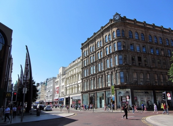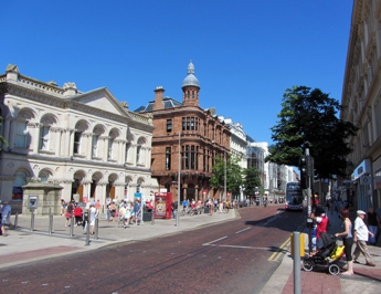 Von der Kirche aus bin ich der Donegall Street zur High Street gefolgt. Diese wird dann nach kurzer Zeit zum Castle Place (ist nur Pl abgekürzt, ich vermute mal das Pl Place heißen soll). Dort wurden die Geschäfte größer und die Häuser feudaler. Ich fand die Architektur entlang des Castle Place, runter die Royal Av und hoch die Donegall Pl recht schön. Alte feudale Häuser, schöne Fassaden. Hier sah es richtig nett aus. Hier in der Donegall Pl gibt’s auch das Belfast Visitor Center (heißt auch glaube ich Welcome Center). Dort bin ich mal rein und habe nach einem Ticket gefragt, mit dem ich alles fahren kann. Bus, Bahn etc. alles was Räder hat. Hm. Da hatte ich die gute Frau auf dem falschen Fuß erwischt. Nach ein wenig Beratung haben wir uns darauf geeinigt, das sich die Stadt sehr gut per Bus erfahren lässt und ich habe mir eine 10er Karte für den Bus gekauft. Eine Smartcard, die man bei Antritt der Fahrt auf so ein Sensorfeld legt und wo dann die Fahrt abgebucht wird. War auch ein guter Kompromiss fürs Portemonnaie, weil das jetzt nicht allzu teuer war.