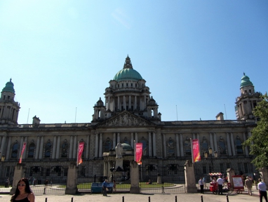 Den Rückweg habe ich dann angetreten wieder am Rathaus vorbei, dann die Chechester Street hoch und abgebogen in die Fußgängerzone entlang der riesigen Mall „Victoria Square Shopping Center“. Hier hab ich aber nur mal nen halben Blick riskiert. Sah aber schonmal echt feudal aus. Der Fußgängerzone gefolgt landet man wieder auf dem Castle Pl ziemlich genau da wo die offenen Sightseeingbusse abfahren. Diesmal wollte ich ausnahmsweise mal so einen Bus nehmen. Hier kostete das Ticket für diesen Sightseeeingbus welches nebenbei 2 Tage gültig ist schlappe 9 Pfund, was ich jetzt für wie schon gesagt zwei Tage geschenkt finde. Das Ticket hatte ich schon vorher im Internet gekauft und konnte den Voucher auch ohne Probleme beim Fahrer einlösen. Es wäre nicht nötig gewesen das Ticket vorher zu kaufen, im Bus war genug Platz für viele weitere Kurzentschlossene. Hier vom Castle Pl (der offizielle Anfang der Tour) fährt der Bus erst mal ein wenig durch die Ecken um dann über den Fluss zum Titanic-Haus zu fahren. Dann geht’s weiter zum Pumphouse und von dort wieder zurück und auf die Stadtautobahn zum Parlamentsgebäude in Stormont. Wenn ich das richtig verstanden habe, tagt dort aber gar kein Parlament (mehr), sondern das riesige Gebäude ist für öffentliche Anlässe zu mieten. Zumindest sah es ziemlich klasse aus, dort eingebettet in eine riesige Parklandschaft mit diversen schnurgeraden Prachtalleen.