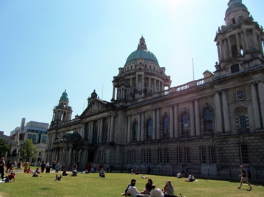 Es hätte noch einen Belfast Visitor Pass oder so ähnlich gegeben, der wäre aber deutlich teurer gewesen und hätte noch ein paar Sachen mit drin gehabt, die ich eh nicht genutzt hätte. Den hab ich mir gespart. Weiter die Donegall Pl hoch läuft man schnurstracks auf das feudale Rathaus zu. Auf den Wiesen davor waren recht viele Leute die auf der dort installierten Großbildleinwand Golf kuckten! Ich glaube bei uns hätte das nicht 10 Leute hinterm Ofen hervorgeholt. Scheinbar ist Golf in Schottland recht populär.