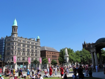 Den heutigen Tag habe ich mit „Stadt angucken“ begonnen. Allerdings war die erste Station direkt um die Ecke vom Hotel die St. Annes Cathedral. Das Haus mit dem großen Celtic Cross. Als ich reinkam wurde ich direkt von einem redseligen Herrn in Empfang genommen, der mir sofort irgendwelche Broschüren in die Hand gedrückt hat und mich zugetextet hat ich solle mich doch direkt mal ins Gästebuch eintragen, und wenn ich einmal dabei wäre, könnte ich ja auch noch ne Spende da lassen. Aha. Darum gings hier. Die Kirche ist ganz OK, die verschiedenen Eckchen und Seitenräume sehenswert. Der silberne Stachel der durch das Dach in den Raum hängt wurde damals nach dem 11. September dort installiert. Was da jetzt genau damit zu tun hat weiß ich zwar nicht, aber man hat sich das damals wohl einiges kosten lassen.