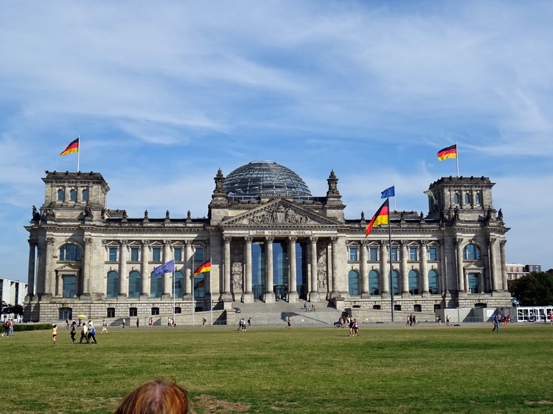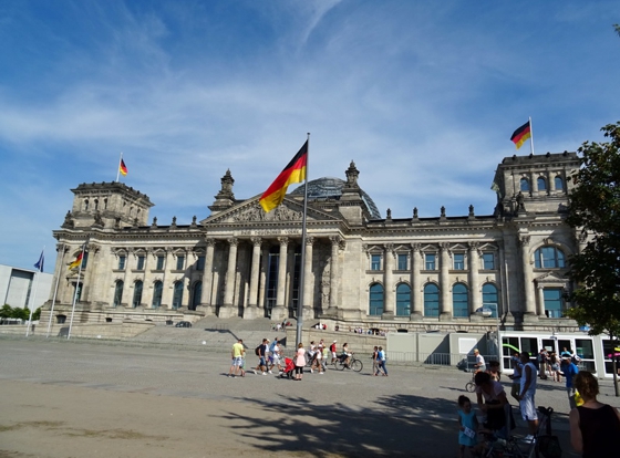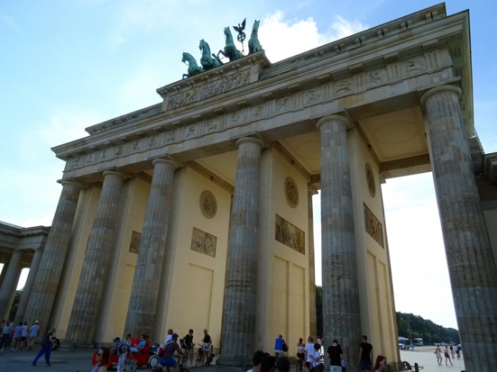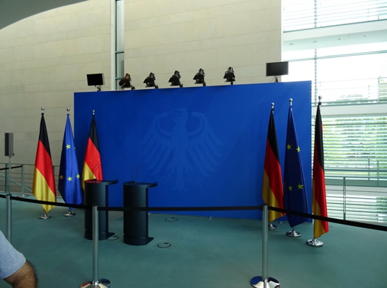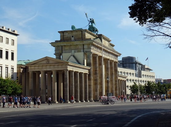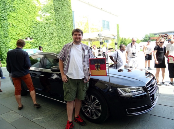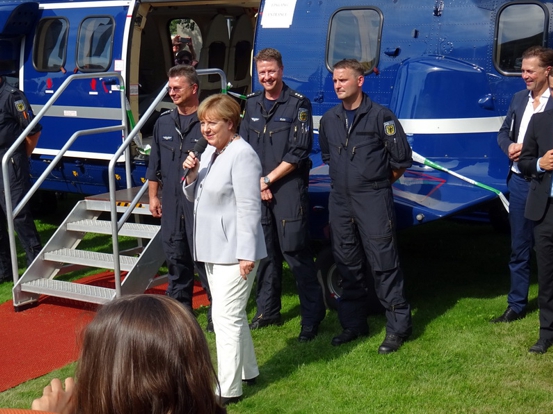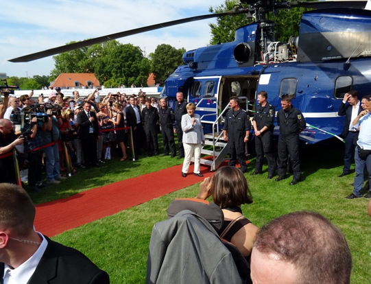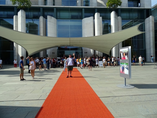 Die Einlasskontrollen waren recht penibel. Nach Durchscannen und Abtasten wurde noch der Tascheninhalt genau gefilzt. Fotoapparat und Handy mussten angeschaltet werden und die Funktionalität demonstriert werden. Sogar in den Geldbeutel ins Scheinefach und Münzenfach hat der Polizist reingeguckt. Gut gemacht. Besser gut kontrolliert als später neben dem Selbstmordattentäter zu stehen. Drinnen war jetzt noch garnicht so viel los. Wir haben uns im Gebäude umgesehen. Da gabs ne Ausstellung mit Staatsgeschenken, da gabs die Presseabteilung und den Saal für Sitzungen und und und. Überall standen fleißige Erklärbären rum, die alle Fragen beantworteten. Also ich fands wirklich gut gemacht. Nach hinten raus im Garten stand die Bundespolizei mitm Kanzler-Hubschrauber. Also der Marine One Hubi vom Obama sieht moderner aus wie der von Angela. A propos Angela. Die Bundesmutti war natürlich auch anwesend und sollte ab 14 Uhr einen Rundgang machen. Wir haben uns pünktlich um 14 Uhr beim Eingang an den roten Teppich gestellt und mit kleiner Verspätung kam sie dann auch umringt von ihrem Sicherheitspersonal nach draußen. Man was war da ein Tumult. Das die Leute nicht gegenseitig übereinander gestiegen sind das war alles. Ich fand es auch vom Sicherheitspersonal ein kleinwenig suboptimal gelöst. Da war nix abgesperrt. Die Meute bahnte sich mit Ellbogen den Weg durch die Leute und die Bodyguards hielten zum Schutz ein albernes Kördelchen als Barriere hin. Als der Tross vorbei war und die ersten Fotos im Kasten sind wir dann wieder hoch zum Hubschrauber. Es hieß das die Kanzlerin später dahin kommen würde und noch ein paar Worten sagen würde. Ne halbe Stunde später kam sie dann auch. Die Polizisten am Hubi standen stramm und Angela hat sich freundlich bedankt fürs in der Gegend rumfliegen. Ich fand die ganze Sache eigentlich sogar recht sympatisch. Der Tross zog nun weiter zum Kanzlerpark, wo noch ne Bühne aufgebaut war. Das haben wir uns jetzt nicht mehr angesehen. Zum einen wars genug Kanzlerin für heute und zum andern auch genug Sonne für heute. Wir haben noch ein wenig im Schatten der Bäume in den aufgestellten Sonnenliegen verschnauft und sind dann gegangen. Nächstes Ziel Reichstag. Ist ja vom Kanzleramt nicht zu verfehlen. Vom Reichstag aus gings zum Brandenburger Tor. Auf dem Pariser Platz haben wir uns noch umgeschaut. Waren heute garkeine Pelzmützenverkäufer oder Sowjetische Fotosoldaten da. Jetzt haben wir uns zum Hopfingerbräu in den Innenhof verzogen und Pause eingelegt. War auch dringend nötig.