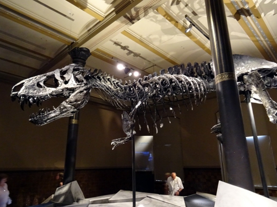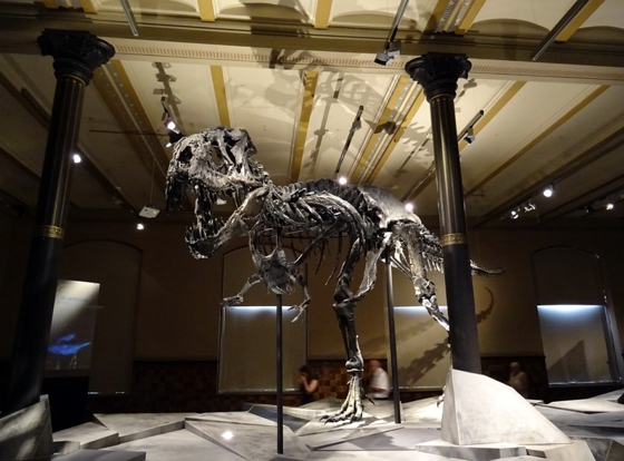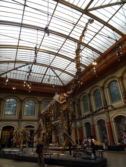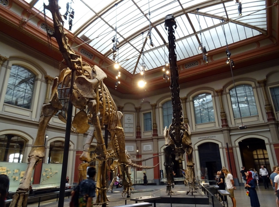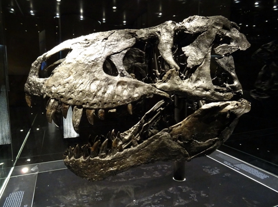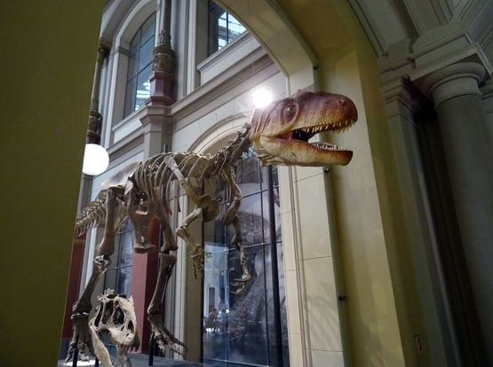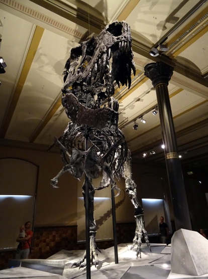 Der Himmel über Berlin. Am heutigen Sonntagmorgen war er wolkenlos. Schon recht früh wars gut über 20 Grad. Ohne Klimaanlage hätt ich die Nacht wohl kein Auge zugetan. Erst mal gings heute zum Frühstück. Das unschlagbare Angebot vom Hotel für 32 Euro pro Person haben wir dankbar abgelehnt. Wir sind Unter den Linden beim Kaffee Einstein eingekehrt. Das gab sich jetzt auch ein wenig nobler. Preislich wars aber doch noch Welten von 32 Eu entfernt. Das Einstein ist scheinbar ne Kette. Habe davon mehrere in Berlin gesehen. Dachte zuerst das sei auch sowas wie Starbucks. Da lag ich aber falsch. Die machen ein wenig auf Wiener Kaffeehaus. Dementsprechend gibt hier auch nicht einfach Kaffee. Nein hier gibt’s nen Verlängerten oder nen Großen Braunen. Alles in allem ganz nett. Nach der kleinen Stärkung gings zum Bahnhof Friedrichstrasse und dort in die UBahn. Nebenbei haben wir dann direkt am Bahnhof noch nen Kaffeeladen entdeckt, den wir uns direkt mal für morgen gemerkt haben. Als erstes heute gings zum Naturkundemuseum. Der gleichnamigen UBahn Station entstiegen sind es nur ein paar Meter. Mit der Berlin Card ist der Eintritt 5 Euro (anstatt 8 glaube ich). Ich bin zwar grundsätzlich kein Freund davon wenn Museen Geld kosten (in anderen Ländern kann man umsonst in alle Museen rein), aber 5 Euro sind jetzt nicht allzuschlimm. Wenn man reinkommt steht man eigentlich direkt in der großen Dino-Halle. Das ist schonmal ein Augenöffner. An die Dinohalle schließen sich ein paar Ausstellungen mit Steinen (Mineralien aller Art) und Planeten, Kometen und Asteroiden an. Laut Beschilderung im Treppenhaus ist auf den oberen Etagen ausschließlich Planeten, Himmelskörper, Kometen, Asteroiden, Mineralien und sowas. Aber dafür war ich ja nicht gekommen. Ich wollte Tristan sehen. Tristan ist der neue T-Rex der gerade im Museum erforscht wird.
