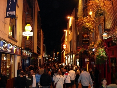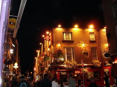 Leider war dort am Eingang die Informationetafel mit Wegkarte so dermaßen noch Graffitti beschmiert ( ich glaube angezündet hatte das auch schon mal jemand ), das da nichts zu erkennen war. So sind wir im Park auch direkt wieder in die falsche Richtung marschiert. Hier haben wir dann aber schnell gemerkt das das nicht richtig sein konnte und sind rumgedreht. Nach gefühltem endlosem Marsch sind wir dann eeeeeendlich mal an einem Wegweiser vorbeigekommen, der uns bestätigt hat, in die richtige Richtung zu laufen. Der Weg geht zum großen Teil durch alten urigen Wald. Vorbei an einem großen Spielplatz ( gut besucht, scheint ein beliebtes Ausflugsziel zu sein ) gehts dann zum Castle. Das steht inmitten einer riesigen und wirklich satt grünen Riesenwiese und sieht echt urig aus. So wie man sich so ein altes Castello so verstellt. Dominiert von den runden Türmen sah das echt schön aus. Leider war für heute schon geschlossen, so das wir nur von außen kucken konnten. Später zurück im Ort war erst mal Pause im Pub angesagt. Aua Füße. An der Bahnstation angekommen mussten wir feststellen, das wir jetzt wieder über eine Stunde auf den Zug warten mussten. Nun, wenn warten, dann aber bitte beim Bierchen. Also zurück in den Ort und den ersten Pub angesteuert, der zu finden war. Von außen recht unscheinbar war das innen ein richtig riesiger Laden. Und hier haben wir auch das erste Mal was anderes wie Guinness und das übliche Einheits-Carlsberg gesehen. Die hatten hier auch die anderen schönen Sachen wie Kilkenny oder Smithwicks. Das mussten wir natürlich erst mal durchprobieren. Was mich wieder zu dem Schluss bringt, das man am besten hier in Irland die Pubs ansteuert, die von außen am schäbigsten aussehen. Die entpuppen sich drinnen nämlich dann immer als wahre Schätzchen. Später endlich die Bahn bekommen war es nun schon fast 9 Uhr als wir wieder in der Stadt zurück waren. Wir sind dann von der Bahnstation direkt nach Temple Bar gegangen um noch nen Laden zu finden, wo wir noch ein wohlverdientes Abendessen finden konnten.