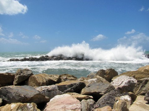 Die Fahrt dauerte recht lange. Zumindest konnte ich mittels Google Maps zwischendurch immer wieder versichern, das ich in die richtige Richtung unterwegs war. Bei dieser Fahrt gabs sogar ne Fahrkartenkontrolle. Auf freier Strecke standen plötzlich drei Uniformierte in der Gegend rum die den Bus gestoppt haben, dann den Bus geentert haben und dann fröhlich die Tickets kontrolliert haben. Haben auch prompt den einen oder anderen erwischt ohne Ticket. Die konnten ja nicht fliehen, weil da wo die Jungs standen ja garkeine Bushaltestelle war, wo man hätte schnell aussteigen können. Was ich dann später von der Pisa Marina gesehen habe, entpuppte sich am ehesten als lange Uferstraße mit diversen "Strandlokalen" und ziemlich viel unruhiges Meer mit unbequemem Stein- und Kieselstrand. Also ne idyllische Gegend war das nicht. Und trotzdem lagen dort diverse Leutchen zwischen den Steinhaufen. Ich bin die Uferstraße noch ein ganzes Stück hochgegangen. Aber irgendwann ging das nur noch unendlich weiter geradeaus ins Nirgendwo. Ganz klein hinten irgendwo am Horizont sah es so aus, as ob da noch größere Hafenanlagen(?) ständen. Genau sehen konnte ich es aber nicht. Und den Elan da noch hin zu fahren hatte ich jetzt auch nicht mehr. Die ganze Zeit blies ein unglaublich scharfer Wind. Irgendwie fühlte ich mich nach ner ganzen Zeit irgendwie eingesalzt und gesandstrahlt. Durch meine Beton-Sturmfrisur kam man nur noch mit schwerem Gerät durch. Durch den Wind hatte ich garnicht gemerkt das ich anscheinend deutlich zu lange in der prallen Sonne rumgelaufen war. Zumindest fing es hinterher im Bus zurück schon an an diversen Ecken zu zwicken. Ein untrügliches Zeichen für drohenden Sonnenbrand. Im Großen und Ganzen war der Ausflug zu dieser Marina jetzt auch nicht wirklich als Erfolg zu werten. War nicht schlecht aber interessant auch nicht unbedingt. Der Bus brachte mich zurück zum Abriss-Busbahnhof und ich bin erst mal ins Hotel, die gröbsten Schäden beseitigen. Zumindest hatte die ganze Aktion ein Gutes. Die Zeit ist recht schnell rumgegangen. Es war jetzt mittlerweile auch schon langsam Zeit was für den Abend zu suchen.
