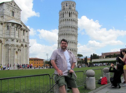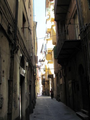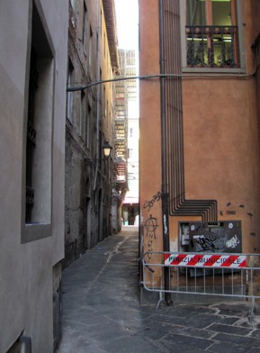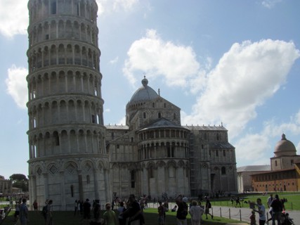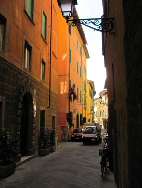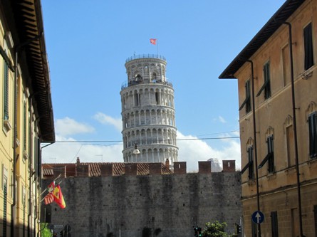 So sehr lange bin ich aber dann doch nicht verweilt sondern bin nachdem ich den Ausgang gefunden hatte wieder hoch zum Dom und zum schiefen Turm gegangen. Da das ja auch das einzig Interessante in Pisa ist, dachte ich, es sein ein guter Abschluss. In der Nähe ist noch ein Stadion eingezeichnet auf der Karte (irgendwas mit Garibaldi). Da bin ich noch kurz hin. Da gab es aber nur ziemlich viele verrammelte Tore und rostige Zäune zu sehen, so das ich schnell wieder umgedreht bin. Vom Turm aus bin ich dann wieder auf verschlungenen Gassenwegen durchs angrenzende Viertel bis runter zum Fluss marschiert. Ich wollte jetzt ein schönes Mittagessen einwerfen. Ich wollte ins Vettovaglie wo ich mir vorgestern schon die Speisekarte angeschaut hatte. Leider musste ich feststellen, das die Mittags nicht aufhaben. Die machen erst am Abend auf. Tja. Also bin ich nochmal ins Porton Rosso gegangen. In Rücksicht darauf das ich ja gleich noch nach Hause fliegen musste, habe ich diesmal die Flasche Wein aber weggelassen.