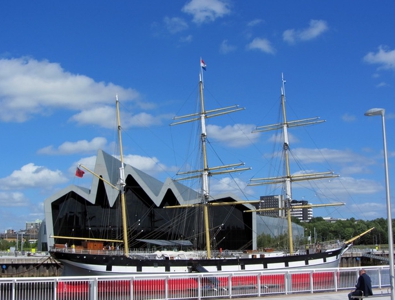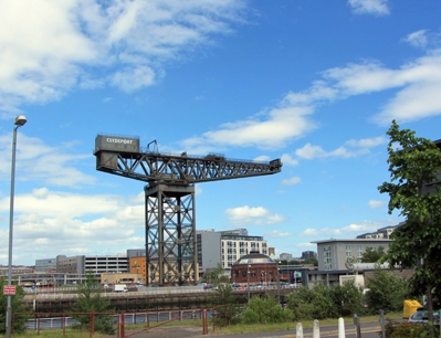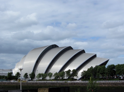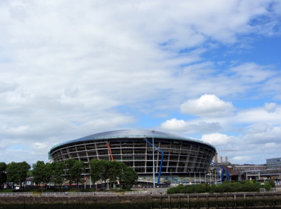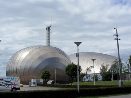 Nächster Versuch Glasgow Science Center. Moderne Glas und Stahlbauten mit Imax Kino. Dazu gings zur nächsten Station Cessnock. Näher geht’s per UBahn aber nicht ran, von hier heißt es zu Fuß. Und das nicht zu knapp. Von der Bahnstation muss man erst mit riesigen Umweg (weil man nicht quer durch kann sondern nur drumherum) durch ein relativ uninteressantes Industriegebiet latschen. Dann kann man sicht entscheiden, ob man links oder rechts um den Festival Park rumlaufen will. Auf der Karte siehts links rum kürzer aus, in der Realität wird es sich nur unwesentlich unterscheiden. Mein Weg rechts rum führte mich nach längerem Marsch etwas oberhalb des Science Center zum Fluss. Von hier hat man einen sehr schönen Blick übers Wasser auf die neue Veranstaltungshalle „The Hydro“ die zu diesem Zeitpunkt noch im Bau war, die alte Veranstaltungshalle „Armadillo“ die wirklich aussieht wie ein silbernes Gürteltier und nach Westen über den Fluss auf die alten riesigen Verladekräne, die immer noch einen Teil der Stadtsilhouette ausmachen.