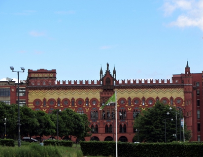 Draußen vor dem Haupteingang ist noch sehenswert die "Doulton Fountain" (der größte Terracotta Brunnen der Welt). Unweit des Palace hatte ein Gebäude meine Aufmerksamkeit geweckt. Das Gebäude sah außen ein wenig aus, wie ein Dogenpalast aus Venedig. Im Reiseführer stand auch was davon, das das Gebäude so ähnlich genannt wird, kann es aber jetzt gerade nicht mehr finden. Ich bin mal hin und habe mir das genauer angesehen, durfte dabei feststellen, das hier offensichtlich ein Restaurant mit angeschlossener Brewery eingebaut war. Da ich jetzt eindeutig ein Bierchen vertragen konnte bin ich auch direkt mal rein. Der Laden heißt einfach WEST. Und was durfte ich hier vorfinden ? Ein schönes rustikales deutsches Brauhaus. Wie "deutsches Brauhaus" wird der Leser jetzt fragen. Also es ist eine Glasgow'er Kneipe, wo man selbstgebrautes Bier nach deutschen Vorbildern in großen Humpen trinkt und gute rustikale Schmakerl wie Gulaschsuppe und Semmelknödel mit Sauerkraut auf der Speisekarte hat.