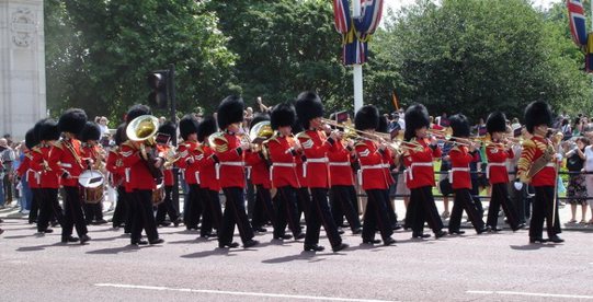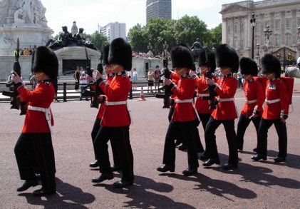 Weiter am See entlang kommt man schließlich zu Hyde Park Corner und sitzt wieder mitten im Straßenlärm. Ich habe den Weg quer drüber und durch den Triumpfbogen gewählt und bin somit stracks auf den Buckingham Palace zumarschiert. Schließlich war mein erstes Ziel für heute die Wachablösung. Auch wenn ich das jetzt schon ein paar Mal gesehen habe ist es immer wieder einen Abstecher wert. Da wird mal kurz der Kreisel vor dem Palace gesperrt und da laufen viele Männlein mit roten Anzügen und riesigen schwarzen Fellmützen rum. Dann wird ne halbe Stunde rumexerziert und alle verschwinden wieder. Das genau jeden Tag ab 11 Uhr. Ob Sonne oder Regen. In England weiß man noch, wie man Traditionen pflegt. Und irgendwie genau deshalb ist es jedes mal wieder einen Blick wert. Heute hab ich die armen Würstchen unter den schwarzen Bärenfellen schon etwas bedauert. Schon so gegen 11 hatte es in der Sonne ein unerträgliche Hitze. Die Jungs müssen im eigenen Saft gekocht haben. Als die Blaskapelle dann zum Auszug geblasen hatte und alle Mützenträger wieder dorthin verschwunden waren wo sie hergekommen sind, habe ich mich durch den James Park durch zur Westminster Abbey begeben. Ich hatte ja noch einen Termin mit dem Da Vinci Code. Am Vordereingang stand ein Schild : Eintritt hinten. Na gut. Wenn ihr meint. Als ich dort ankam ist mir aber echt der Mund aufgeklappt. Eine unüberschaubare Menschenmenge stand vom Eingang der Kirche zurück bis zur Straße (immerhin bestimmt 50 Meter) und dort weiter auf dem Bürgersteig Richtung Parlament (habe ich schon gesagt das Engländer sehr brave Schlange-Steher sind ?). In dieser Szenerie fehlten jetzt wirklich nur noch die "Ab hier noch 3 Stunden" - Schilder. Außerdem sollte der Spaß auch noch 8 Pfund Eintritt kosten. Nee, beim besten Willen nicht. Auf Wiedersehen.