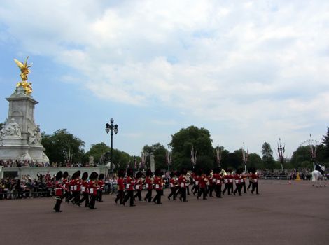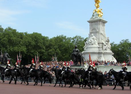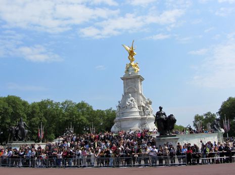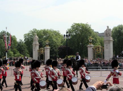 Ab heute hatte ich mir vorgenommen, nochmal die gängigen Touristensachen abzuklappern, was ich nämlich seit etlichen Jahren nicht mehr gemacht habe. Angefangen habe ich den Tag daher mit der Wachablösung. So viele Jahre ich jetzt schon regelmäßig nach London fahre, die Wachablösung habe ich seit etlichen Jahren nicht mehr gesehen. Mit der UBahn gings nach St. James Park. Eigentlich hätte man von dort durch den Park direkt nebenan in gerader Linie zum Buckingham Palast kommen können, wenn da nicht das abgesperrte Gelände von irgendeiner Behörde oder Kaserne im Weg gewesen wäre. Doof. So ging es dann die Straße entlang auf dem längeren Weg zum Palast. Dort angekommen waren schon die bekannten Massen anwesend. Das Spektakel begann auch recht pünktlich zur avisierten Zeit 11:30.