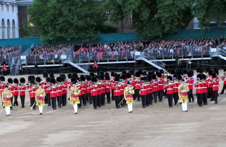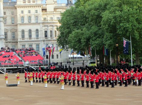 Der zweite Trip nach London in diesem Jahr war Teil einer kleinen Kombireise. Nach dem Bruce Konzert in Wembley ging es weiter nach Glasgow (auf für Bruce) und schließlich wieder zurück nach London um die Killers in Wembley zu sehen. Aber hier an dieser Stelle erst mal den ersten Teil dieser kleinen Tour. Anreise war diesmal ausnahmsweise wirklich sehr entsannt, da diesmal auch alles pünktlich war und funktionierte. Hotel war diesmal in der Stadt direkt bei der Victoria Station das Doubletree by Hilton. Vorweg kann ich schon mal sagen das das Hotel recht gut war. Zimmer groß, vernünftig ausgestattet. Funktionierende Klimaanlage und ausreichend ruhig damit man auch mal ein wenig länger pennen konnte. Was will man von einem Hotel mehr. Die zentrale Anbindung an die Victoria Station war auch erste Sahne. Hier wird allerdings im Moment ziemlich gebaut. Kommt man mit der Piccadilly Line an, dann kommt man mitten in einer riesigen Baustelle ans Tageslicht. Hier musste ich mich erst mal orientieren. Als mein IPhone aber dann mal ein GPS Signal hatte habe ich das Hotel fast direkt gefunden (bin nur einmal falsch abgebogen). Im Hotel habe ich noch nach dem nächsten Laden für was zu trinken und zu knabbern gefragt. Da hat man mich zu einem Saintsbury (werden die so geschrieben ? keine Ahnung) ein paar Straßen weiter geschickt. Später habe ich dann festgestellt, das es in der Victoria Station einen Marks und Spencer Food Laden gibt, der viel näher ist. Die Nahrungsaufnahme erfolgte in einer Sportsbar mit dem originellen Namen "Sports Bar and Grill" ebenfalls in der Bahnstation. Hier lies es sich aber echt gut aushalten und nen Burger und ein/zwei Pints später war es auch Zeit für den geplanten Programmpunkt des Abends. Das Beating Retreat. Eigentlich bin ich da nur zufällg drauf gestoßen bei der Suche nach Informationen über den Ablauf der Feierlichkeiten für den Queen Geburtstag. Das Beating Retreat ist so etwas wie das Schaulaufen aller Uniformen und Fellmützen mit Musik, was jährlich stattfindet. Diese Zeremonie wird immer von einem Mitglied der Königsfamilie besucht. Das wusste ich aber da zu dem Zeitpunkt noch nicht.