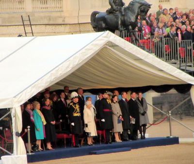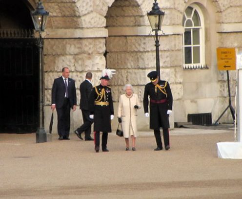 Und ganz pünktlich sagte dann der Sprecher "Jetzt Bitte alle aufstehen und die Queen begrüßen". Dann wurde die (kleine!) alte Dame hineingeführt, die Nationalhymne wurde gespielt und ganz feierlich kamen dann die ersten Truppen aufmarschiert. Ich fand das wirklich sehr gelungen und ich habe mich den Abend lang sehr gut unterhalten gefühlt. Nach ca. 1,5 Stunden wurde dan der Zapfensreich geblasen und nochmal "God save the Queen" gespielt und die Queen wurde in der Staatskarosse langsam über den Platz nach Hause gefahren.