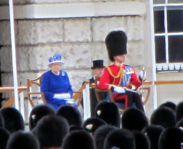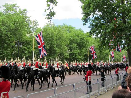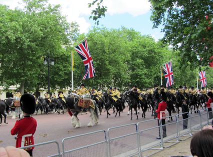 Pünktlich um 12 Uhr gings dann los, die Dicke Backen Musik wurde lauter und dann ging der Auszug der Truppen los. Zuerst diverse Pferdekompanien, ein paar offene Kutschen mit Mitgliedern der Familie (Prinz Harry und so), dann musizierende Fußtruppen und zwischendrin in angemessener royaler Winkegeschwindigkeit die Queen in ihrer Staatskutsche.