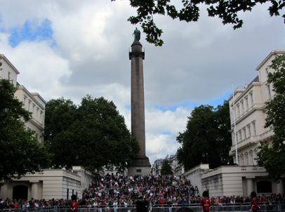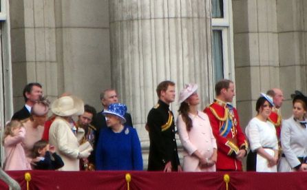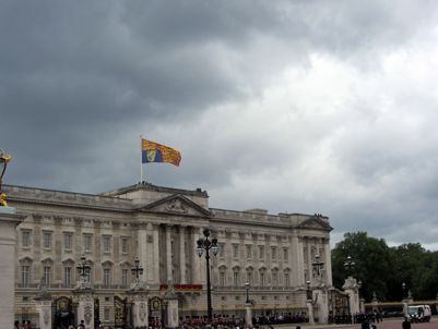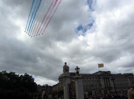 Alle Leute applaudierten und riefen Hooray Hooray und als dann der Rest Kompanie vorbei war, strebte jeder in Richtung Buckingham Palace. In Richtung Buckingham Palace wurde es immer voller und irgendwie wurde ich zur Seite auf die Bürgersteige abgedrängt und fand mich dann später an einer Ecke des großen Kreisels in Mitten von vielen Absperrungen und vielen Leuten wieder. Eigentlich hätte ich mir gewünscht näher dran zu sein. Aber von hier konnte ich auch alles sehen. Als dann irgendwann alle Truppen ihren Marsch beendet hatten, wurden auch die Absperrungen an der Mall geöffnet und die vielen Leute die noch von hinten nachkamen durften dann direkt zum Palace durchlaufen. Das hätte ich mal früher wissen müssen. Naja. Das nächste Mal. Gegen 13 Uhr versammelte sich dann die ganze Royal Family auf dem Balkon des Buckingham Palace und der Überflug der Lufteinheiten begann. Zuerst Hubschrauber, dann größere Maschinen, dann diverses Zeug und am Ende dann der Überflug der Düsenjäger mit den Farben des Union Jack.