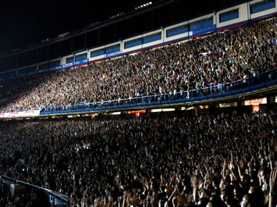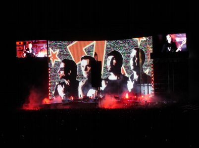Ich habe noch versucht was zu Futtern zu kriegen. Es gab genau 2 Sachen : Salamibrote und Schinkenbrote. Auch mal was Neues. Ich wunderte mich die ganze Zeit, das die Frauen so brav vor der Damentoilette anstanden. Normal ist es ja so, das irgendwann bei den Herren die Kabinen mitbenutzt werden. Als ich selbst mal in die Keramikabteilung musste, habe ich gesehen warum. Die Herren hatten garkeine Kabinen. Da war ne lange Pissrinne an der Wand und das wars. Unglaublich. Wie hat dieses Stadion die Fifa 5-Sterne Wertung bekommen ??? Allerdings war die Stimmung schon weit vor dem Konzert sehr gut. Die Zeit wurde mit Gesängen und La Ola verbracht. Alles ziemlich locker. Das Stadion war im Vergleich zum Camp Nou recht klein. Somit waren die Leute auch um einiges näher zusammengepackt. Das hat auch den ganzen Abend über zu einer recht intensiven Stimmung geführt. Das Konzert war gewohnt gut. Routiniert wurde "Standard" gespielt. Heute hat's wieder recht lange gedauert, da Bono zwischendurch oft und lange gesprochen und seine Spanischkünste demonstriert hat. Nach fast 2,5 Stunden war dann der letzte U2-Abend für diese Europatour gekommen. Schade eigentlich. Ich hatte schon eine richtige Routine entwickelt :-)
