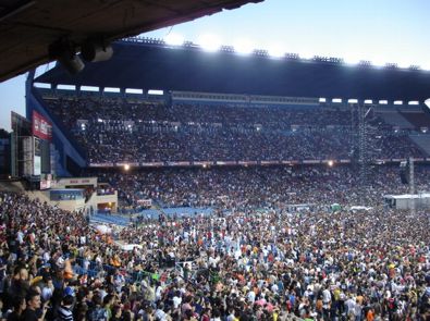 Dann habe ich Vertigo-Zeit ausgerufen und wir haben uns aufgemacht zum Stadion. Was passiert wenn man genug Leute auf die Straße stellt. Richtig : Nix geht mehr. Das war auch vor dem Stadion so. Verkehrsmäßig lief rundherum nichts mehr. Der Einlass war sehr locker. Schon nach ein paar Minuten stand ich in den Katakomben des Stadions. Oh Mann. Was für ein heruntergekommener Pott. Dreckige Betontreppenhäuser, schlechte Beschilderung, kaum Verkaufsstände für Verpflegung ( und wenn dann mit königlichen Preisen ). Dies ist das erste Stadion wo ich meinen Platz nicht gefunden habe. Laut Ticket sollte ich Treppenhaus 12 nehmen. Bis 11 ging noch alles gut. Leider gings dann aber erst mit 17 weiter. Wo die Treppenaufgänge mit den anderen Nummern sind, weiß ich bis heute nicht. Irgendwann nach diversen Versuchen ( was macht jemand der sich genausowenig auskennt ... richig ... er schickt einen erst mal weiter ) hatte ich jemanden mit Kompetenz gefunden. Die gute Frau hat an ihrem Funkgerät ungefähr 5 Minuten rumgefunkt und mit jemandem gequatscht. Danach wusste sie zumindest grob wo mein ominöser Block ungefähr sein müsste. Und Oh wunder, ich habe es gefunden. Ich habe dann mal geschaut wie diese Aufgänge nummeriert waren. Hätte ich doch mal 7 oder 18 genommen. Warum schreiben die nur 12 auf die Karte ??