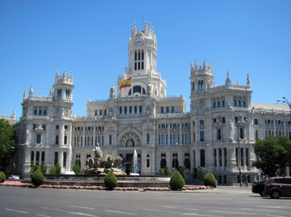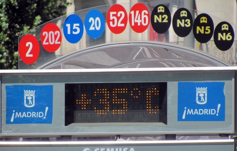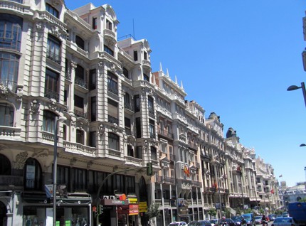 Ab der Station Plaza de Espana bin ich danach zur großen Prachtstraße Gran Via gegangen. Diese geht einmal quer durch die Stadt sozusagen als Schneise und wird auf beiden Seiten von recht prunkvollen Gebäuden flankiert. War mal irgendso ein Franco Prestige Projekt. Alles was damals im Weg stand wurde plattgemacht und diese Prachtstraße wurde da gebaut. Wenn man da entlang geht sollte man immer den Kopf nach oben wenden. Meist sind die Gebäude gerade im Dachbereich aufwändig verziert oder es stehen irgendwelche Statuen rum. Recht unten am Anfang hab ich Station gemacht im Haus der 100 Brötchen (irgendwas mit 100 Montaditos oder so) und habe da mal was gefuttert. Ich find diese Kette (ich glaube ist ne Kette, von den Läden gibt es in vielen spanischen Städten Pendents) recht gut. Die Brötchen (kann man die als Tapas bezeichnen ? Sind ja eher kleine Minibaguettes) sind wirklich vielfältig und eigentlich immer gut (außer man verliest sich auf dem Bestellzettel und ordert etwas ganz schlimmes). Hui. Alleine das Entlangwandern die Gran Via hinunter war bei der Hitze anstrengend. Als ich irgendwann später so gegen 15 Uhr beim Retiro Park angekommen bin, wurden an einer Tafel aktuelle 32 Grad angezeigt.
