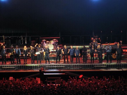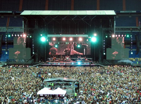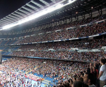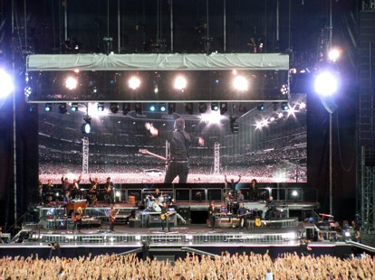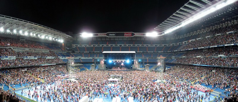 Später ging es dann zum Bernabeu. Mit der Ubahn zur Metrostation Bernabeu zu kommen war kein Problem. Vor dem Stadion war ein unglaublicher Betrieb. Das lag auch daran, dass ein großer Teil des Stadionvorplatzes für ein Public Viewing Gelände für die EM abgesperrt war. Auf dem verbleibenden Platz ging teilweise garnix mehr. Menschenstau. Irgendwann nach viel Drängeln und Drücken hatte ich es dann doch geschafft das Stadion einmal zu umrunden. Meinen Eingang habe ich dann recht fix gefunden (wenn man mal herausgefunden hat wo die Nummern da angebracht sind dann weiß man auch wo man ist). Allerdings war hier auch eine ewig lange Warteschlange. Irgendwie wollten gefühlte hundert Leute das Ticket kontrollieren. Ich war irgendwann mal so um 21 Uhr dann drinnen auf meinem Platz. Bruce hat mit seiner üblichen Verspätung angefangen. Da wo ich war hatte ich meinen Platz zwar recht nahe an der Bühne aber leider unter dem Balkon der darüberliegenden Tribüne. Das hatte zur Folge das die Musik irgendwie dumpf bei mir ankam. Das gefiel mir nicht. Da ich wusste das das Stadion nicht komplett ausverkauft war, habe ich mich mal umgeschaut und dann auch einen schönen Block ins Auge gefasst. Dort bin ich dann während „City of ruins“ hingegangen. Das war eine klasse Entscheidung. Ich hatte den Rest des Abends besten Blick, besten Sound und Platz um mich herum. Klasse.