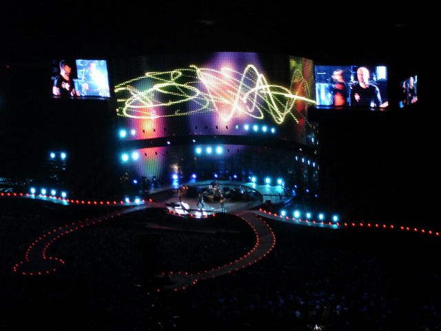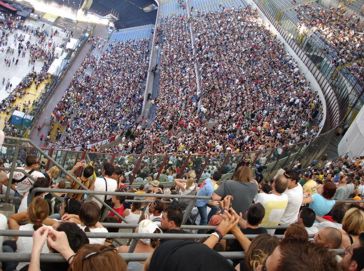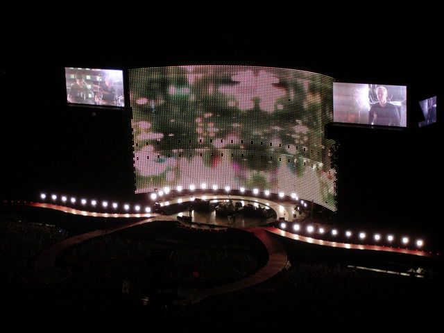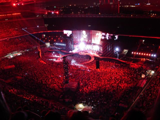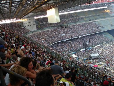 Gegen 16 Uhr habe ich mich dann wieder zum Dom begeben, da ich da recht genau wusste, wo die Haltestelle der Tram 16 war. Von hier aus fährt man mit der Tram eine gute halbe Stunde bis 40 Minuten zum San Siro Stadion. Eigentlich heißt es ja Guiseppe Meazza Stadion, aber da die Schüssel im Stadtteil San Siro steht, sagen alle nur San Siro Stadion. Endlich wieder U2 ! EEEELEVATION !!!! Eingangskontrollen gab es so gut wie gar nicht. Es wurde die Karte gescannt und das wars auch schon. Ich hätte eine Sackkarre voll Kram hochfahren können, das hätte keinen interessiert. Dementsprechend haben die Italiener auch alles was nicht niet und nagelfest ist ins Stadion gekarrt. Vom Campingsausrüstungen im Innenraum über Fußballspieler bis ganze Bierkästen (!) habe ich alles gesehen. Auch die Schwarzhändler haben das genutzt. Die haben im Stadion auf den Rängen die nachgemachten U2 TShirts verkauft. Hat keinen interessiert. Hat man wie ich Karten für den drittem Umgang ( 3 anello ), dann muss man außen in den von mir so getaufen "Korkenziehertürmen" wie in einem riesigen Wendelgang bis ganz nach oben laufen. Da vergehen wirklich etliche Minuten bis man da ganz oben angelangt ist. Beim ersten Blick von oben ins Stadion rein war ich sehr beeindruckt. Ein richtiger Augenöffner !