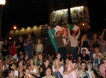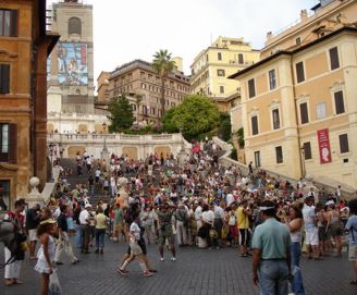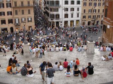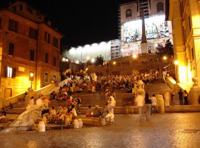 Ich bin dann so langsam zur Spanischen Treppe gepilgert. Auch hier ziemlich viel Betrieb. Erst mal alles angeschaut und von oben ein paar schöne Fotos geschossen. Dann habe ich ein paar andere Verrückte ( natürlich nur im positiven Sinne ) U2 Fans getroffen und wir haben in einer feindlichen Übernahme die spanische Treppe in eine U2 Treppe verwandelt. Nachschub in flüssiger Form gab es aus einer Tabacceria um die Ecke, die große Flasche Bier ( 0,66 L ) für 3 Euro 50. Der netten Frau im Lädchen drehten sich schon die Dollarzeichen in den Augen jedesmal, wenn wir um die Ecke gebogen sind. Es wurde ein sehr schöner Abend und auch ein recht feuchter ... . Wir haben es sogar noch geschafft, das die anwesenden Gitarrenspieler noch irgendwann "With Or Without You" gespielt haben. Die Melodie kannten sie zumindest. Mit dem Text haben wir dann gerne ausgeholfen :-)