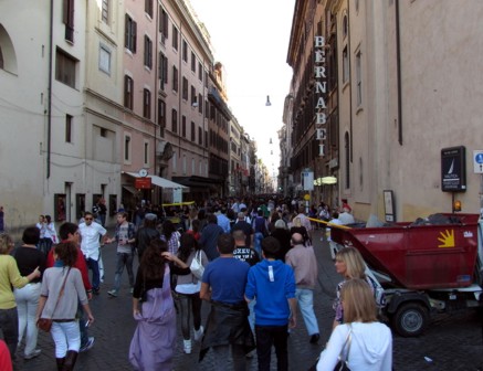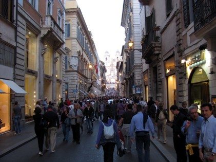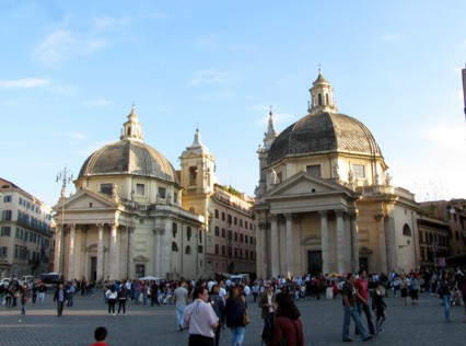 Von hier bin ich mit dem Bus wieder zur nächstgelegenen UBahnstation gefahren und wieder zurück in die Stadt. An der Piazza del Popolo bin ich dann wieder in der Stadt zurück ans Tageslicht gekommen. Schon auf dem Platz war ein ziemlicher Betrieb. Die beiden Kirchen am Rand des Platzes bilden so etwas wie das Einfallstor zur Fußgängerzone. Hier war solch ein Betrieb, das man außer einem durchgehenden Menschenmeer eigentlich nichts mehr sehen konnte.