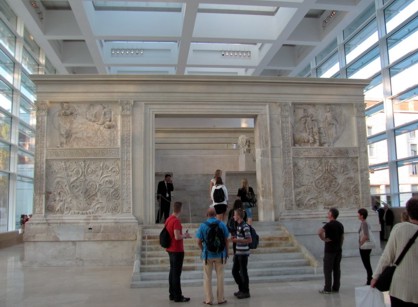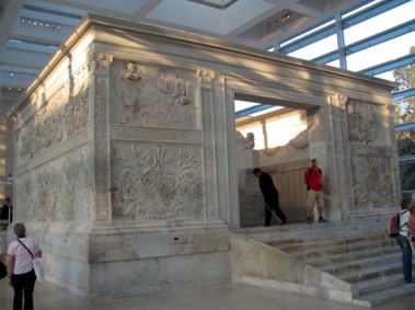 Ich wollte zum Ara Pacis, dem Friedensaltar des Augustus. Dieses Heiligtum wurde auf dem Marsfeld aufgestellt, als Augustus im Römischen Reich den Frieden wiederhergestellt hatte. Das Ding war bis zu seiner Wiedereröffnung gut 10 Jahre lang restauriert worden. Mal kucken ob es sich gelohnt hat. Zuerst habe ich wegen der unglaublich vielen Leute auf der Via del Corso (die übrigens schnurgerade bis zum Nationaldenkmal an der Piazza Venezia durchgeht) den Abzweig übersehen. OK, ich war auch abgelenkt von den vielen Geschäften, zugegeben. Nach einer kleinen Ehrenrunde hats dann aber doch geklappt und ich habe den Bau geentert, wo das Ding aufgestellt ist. Eintritt 8 Euro. Jooo. Das Ding ist schon groß und eindruckerweckend. Man sollte auch mal komplett rumgehen und die ganzen Reliefs sich anschauen. Sehr gut ist die Ausstellung im Museum unter dem Altar. Hier wird zum einen die Geschichte von dem Teil, der Bau, das Vergessen und Wiederfinden dokumentiert. Als ich da war gab es noch ein andere Ausstellung die sich mit der Industrie von Italien und bedeutenden Baudenkmälern der Industrieära beschäftigte. Hier habe auch zum ersten Mal ein Bild von oben, von dem großen Fiat Gebäude in Turin gesehen, wo die Rennstrecke auf dem Dach ist.