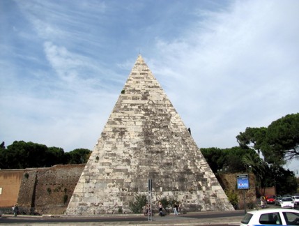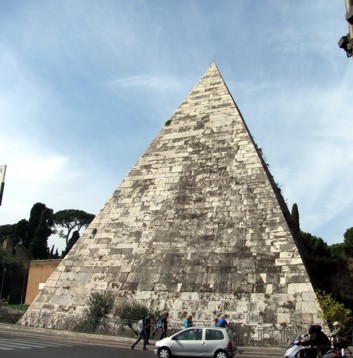 Von den Thermen bin ich nach Begutachtung alles interessantem denn wieder zur UBahn Station und zur Station Piramide gefahren. Diese Station heißt so, weil hier wirklich eine riesige Pyramide mitten in der Weltgeschichte rumsteht. Die Cestius Pyramide ist das Grabmal des Volkstribun Cestius, der nebenbei noch ein großer Ägyptenliebhaber war. Die Pyramide wurde für ihn gebaut und in die alte (damals noch nicht alt, sondern modern und neu) Aurelianische Stadtmauer integriert.