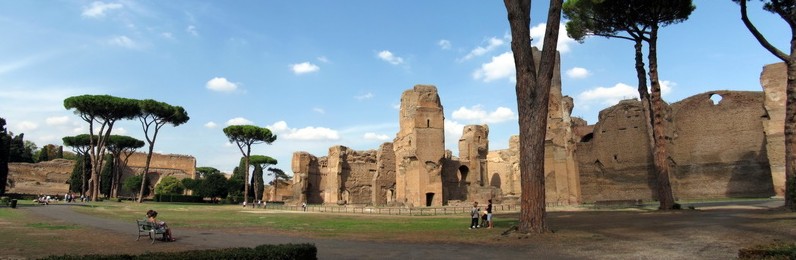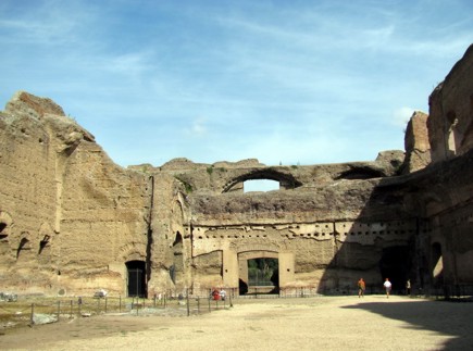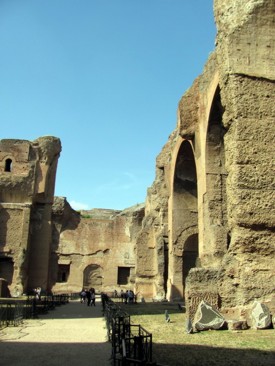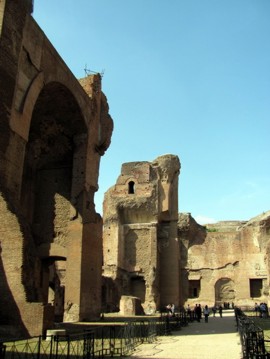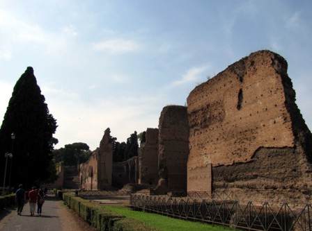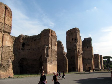 Soderle. Letzter Tag. Mein Flieger geht irgendwann am frühen Abend so das ich noch genug Zeit habe, den ein oder anderen Programmpunkt abzuhaken. Mit dem Bus geht es wieder zum Bahnhof. Heute noch mehr Betrieb im Bus, man steht wie die Ölsardinen. In der UBahn ist es nicht wesentlich anders, ich bin froh als ich am Cirus Maximus endlich raus bin. Mein Ziel sind die Caracalla Thermen, die nur unweit des Circus auf der anderen Seite der unglaublich stark befahrenen Straße liegen. Eintritt hier 6 Euro. Die Caracalla Thermen waren so ziemlich die größten öffentlichen Badeanlagen im alten Rom und haben sich auf einer Fläche von fast 11 Hektar erstreckt. Da gab es warme Bäder, kalte Bäder, Sport- und Freizeiteinrichtungen und sogar so etwas wie Tagungsräume, wo man mit einer ganzen Gesellschaft verkehren konnte.