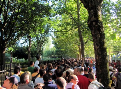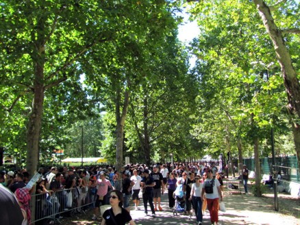 Nach spätem Start in den Tag hab ich mir gedacht, fahr doch noch Mal zum Stadion. Zumal der Bus der Linie 10 ja fast direkt um die Ecke vom Hotel vorbeifuhr. Gesagt, getan. So gegen Mittag bin ich dann also am Stadion gewesen und musste feststellen das a) seit gestern Abend noch ein ganzer Haufen Absperrungen dazugekommen war (die hatten eine ganze Seite der Hauptstraße gesperrt) und das b) mittlerweile ziemlich viele Leute schon anstanden für ins Stadion.