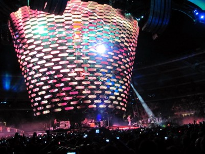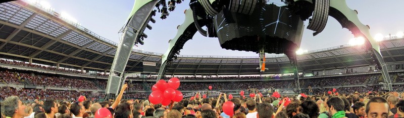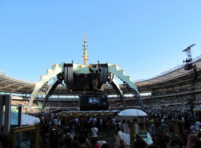 Die Pizza und ein, zwei Bierchen später habe ich mich aufgemacht zum Hotel zurück. Ich hatte mein Ticket dort vergessen. Der Rückweg führte mich am Castello vorbei und am Palazzo Reale. Nett, hübsch. Den Palazzo muss ich mir morgen mal genauer ansehen. Mit einer Tram auf Platz vor dem Castello bin ich dann zurück ins Hotel. Dort habe ich dann den Fehler begangen mich "mal Kurz" aufs Bett zu legen. Hm. Später so gegen halb sechs war ich wieder wach. Jetzt aber mal schnell auf zum Stadion. Also ich mit dem vollkommen überfüllten Bus dorthin. Und vor dem Stadion war nun eine Warteschlange für in den Innenraum, so das ich mit dem Bus auch eine Station früher hätte stoppen können. So musste ich erst mal diverse Meter wieder zurücklaufen um mich einzureihen. Lange Rede, kurzer Sinn, um sieben Uhr war ich im Stadion. Eigentlich dachte ich immer für Innenraum ist das verdammt spät. In Italien aber scheinbar nicht. Da kamen nach mir noch viele Leute. Nach meinen Erfahrungen der nächsten Konzert hätte ich wohl auch noch in den Front-Of-Stage Bereich gekonnt. Naja. Also habe ich brav auf Viertel nach Neun gewartet und schon startete die erste u2 Show in Europa im Jahr 2010.